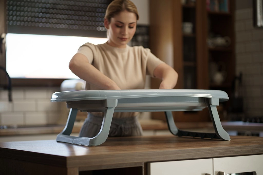 La base en polypropylène robuste, les pieds rabattables et les bords rehaussés assurent stabilité et sécurité lors d’une utilisation quotidienne.