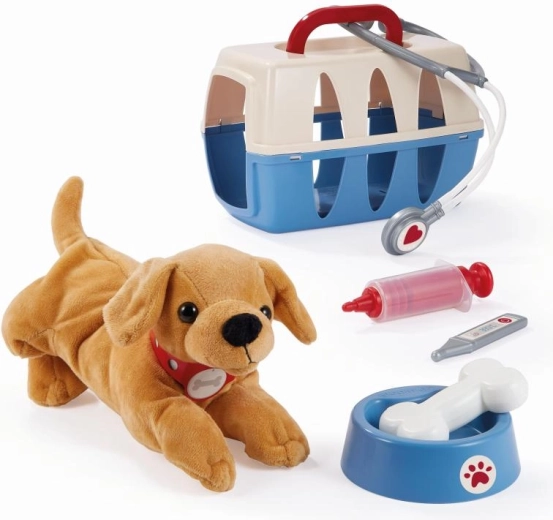 Un set ludique pour les petits amoureux des animaux : une mallette avec un chien et de nombreux accessoires pour jouer au vétérinaire. La mallette sert à la fois de boîte de transport et de espace de rangement pour l’équipement. Inclus : stéthoscope, thermomètre, seringue, gamelle et os – tout le nécessaire pour prendre soin du petit compagnon.