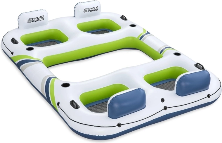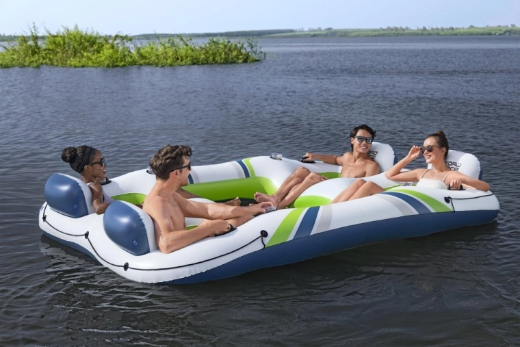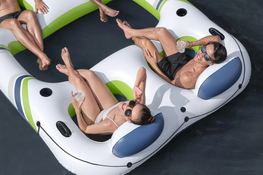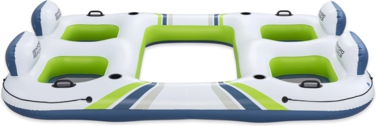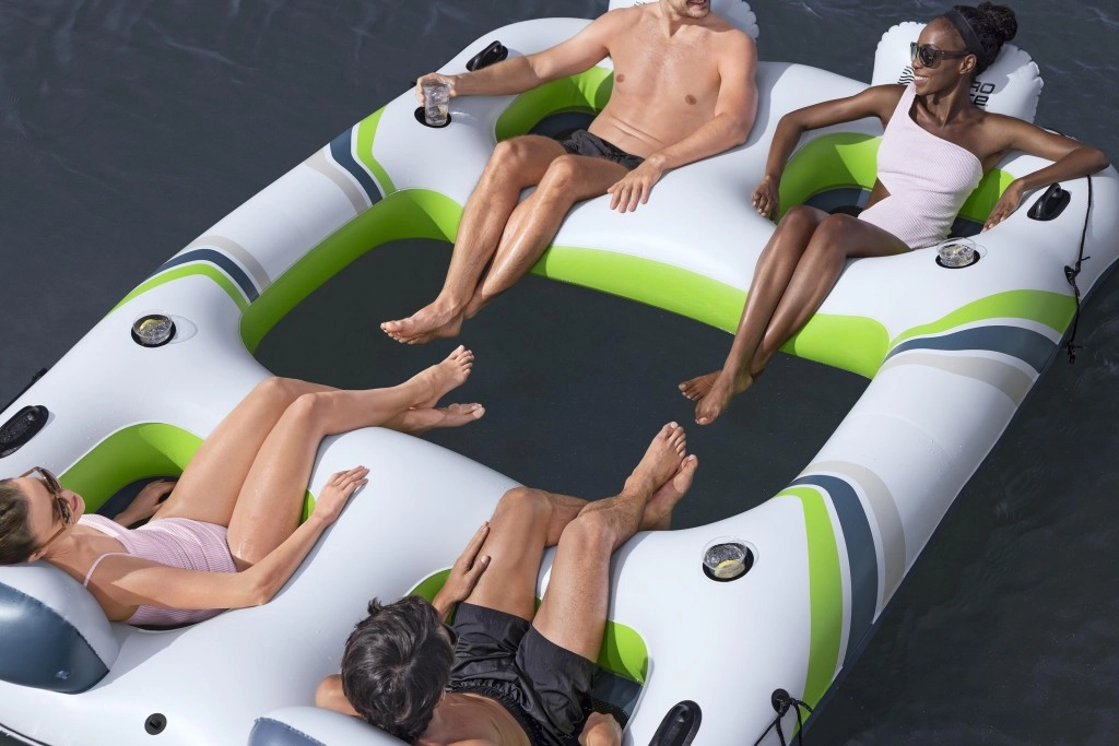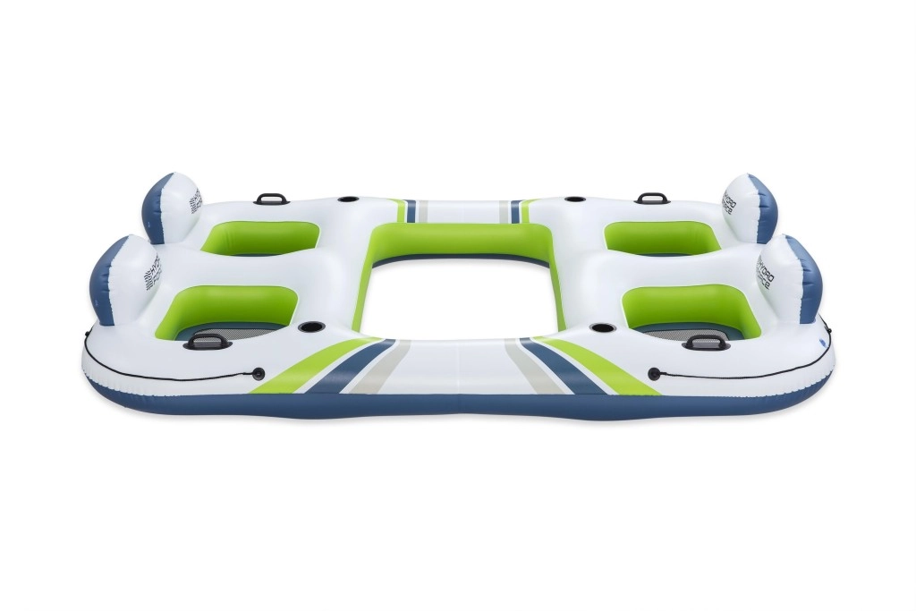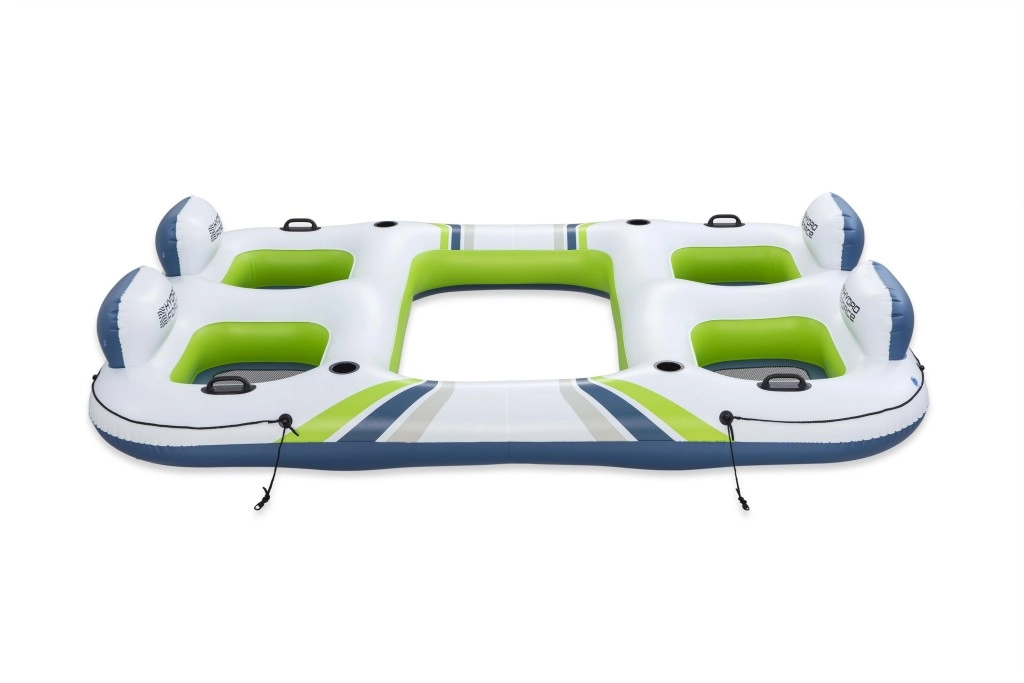 Profitez d’une détente parfaite sur l’eau avec une île spacieuse pour quatre personnes. Grâce au matériau Inflata‑Shield™, elle offre une meilleure résistance à la perforation, une structure rigide et une excellente rétention d’air. Quatre dossiers rembourrés, des assises en maille pour rafraîchir les jambes, des porte-gobelets et des poignées pratiques assurent confort et sécurité. Le système Clasp ’N Go™ permet une connexion facile avec d’autres bouées. Charge maximale jusqu’à 400 kg.