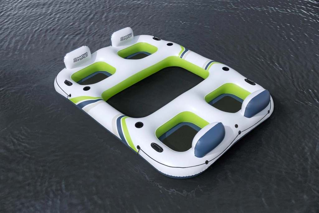 La grande île gonflable HYDRO‑FORCE est idéale pour se détendre sur un lac, en mer calme ou dans une piscine. Quatre sièges ergonomiques avec maille rafraîchissent agréablement les jambes et l’ouverture centrale permet de se rafraîchir à tout moment de la journée. Grâce aux multiples chambres à air, aux poignées robustes et à la corde périphérique, l’embarquement et la manipulation dans l’eau sont faciles et stables.