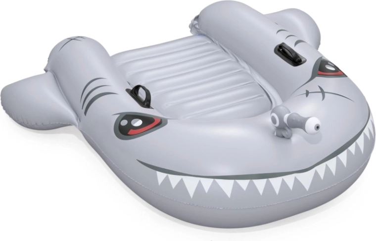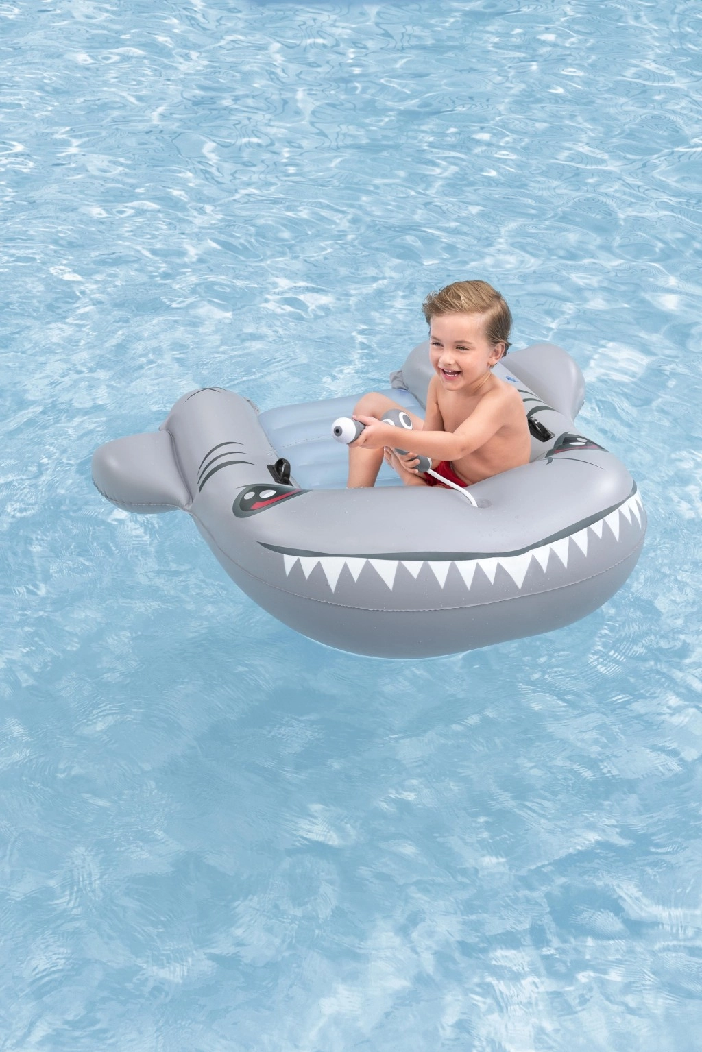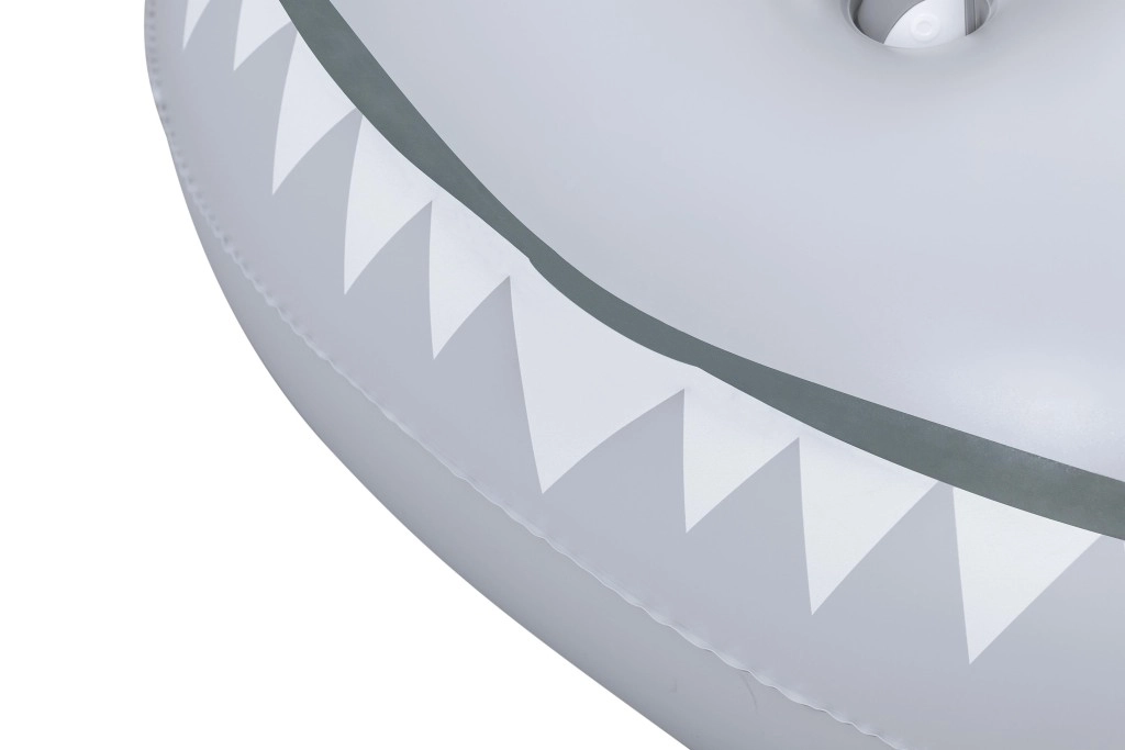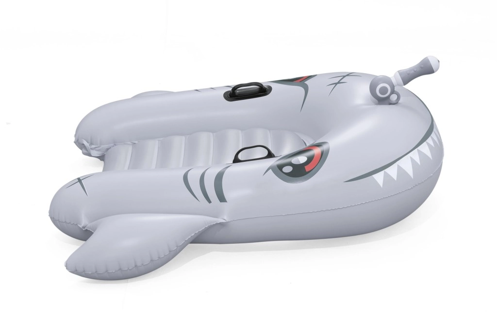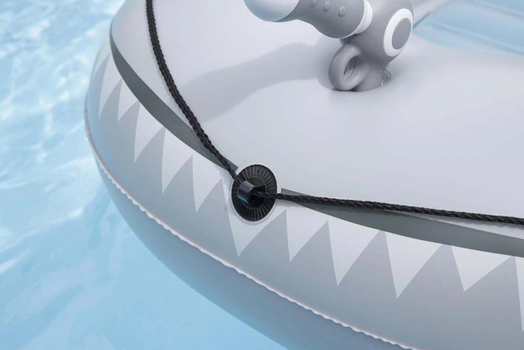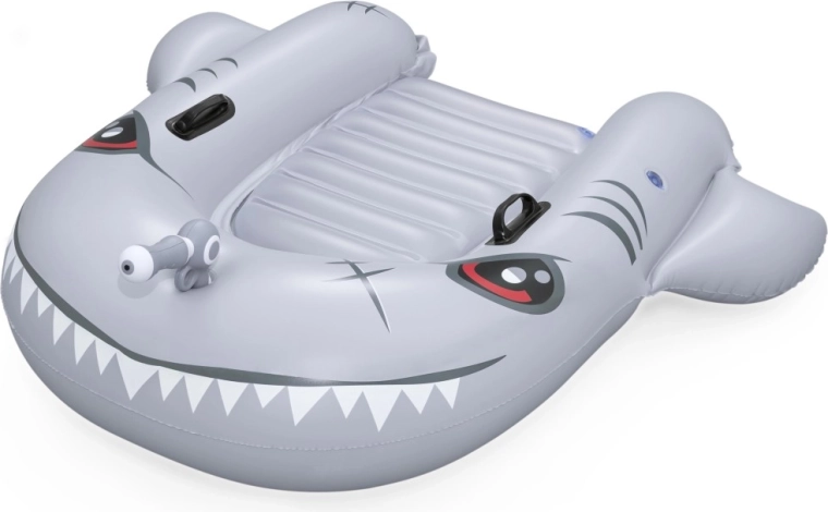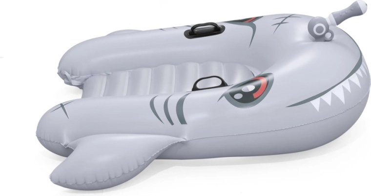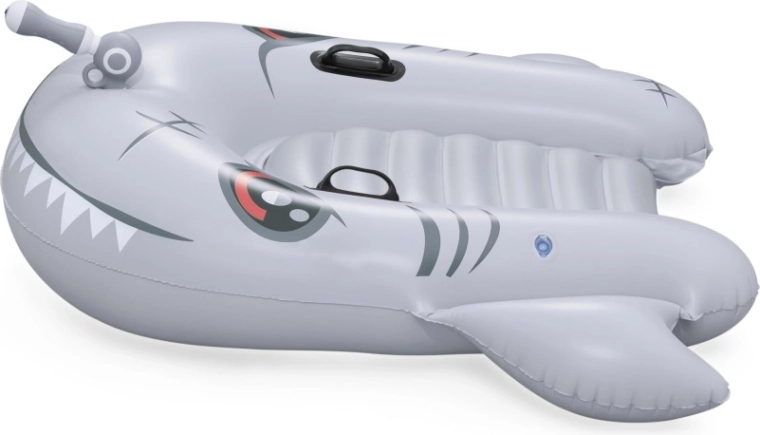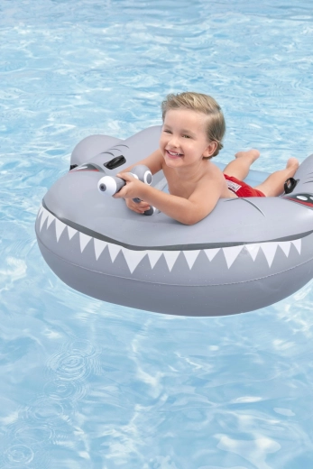 L’embarcation gonflable en forme de requin apporte une dose de fun et de confort à la piscine. Son design gris argenté réaliste avec yeux et dents attire le regard, tandis que l’assise nervurée et les bords relevés assurent une position stable et confortable. Deux poignées solides aident les enfants à garder l’équilibre et à manœuvrer facilement.