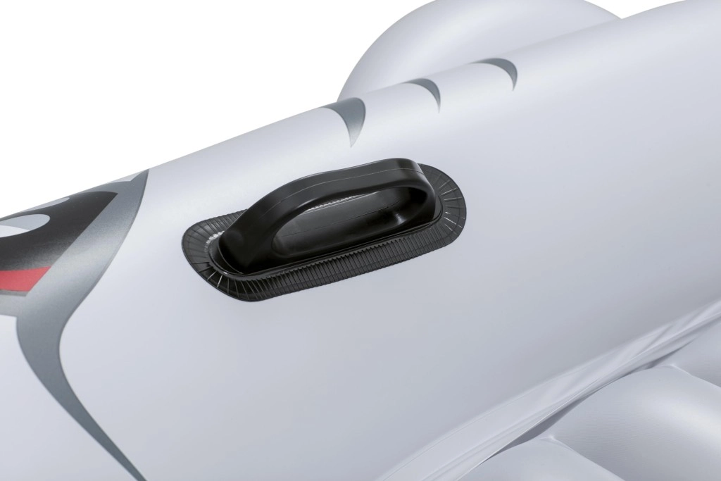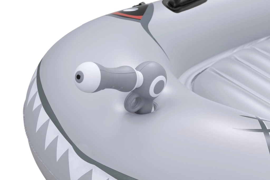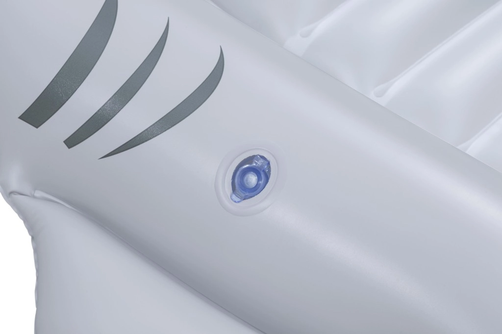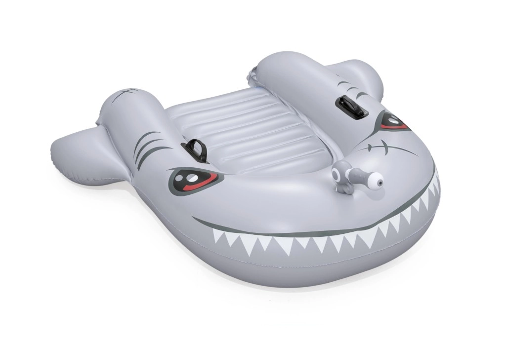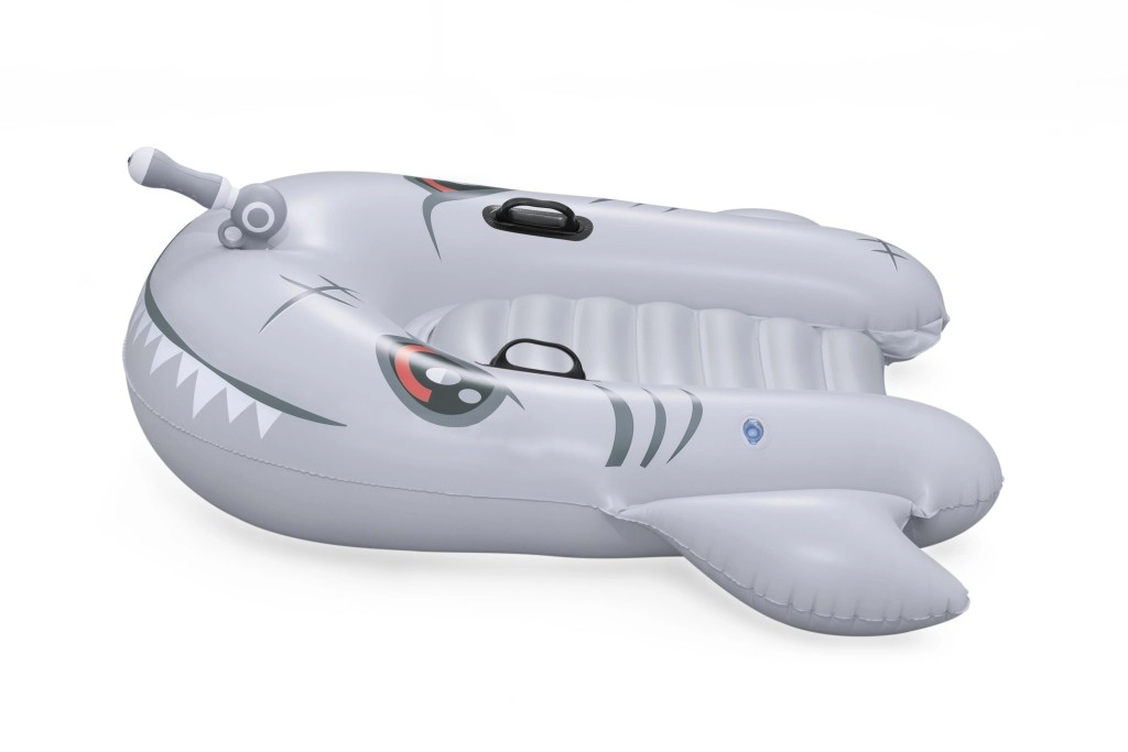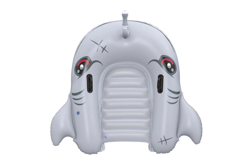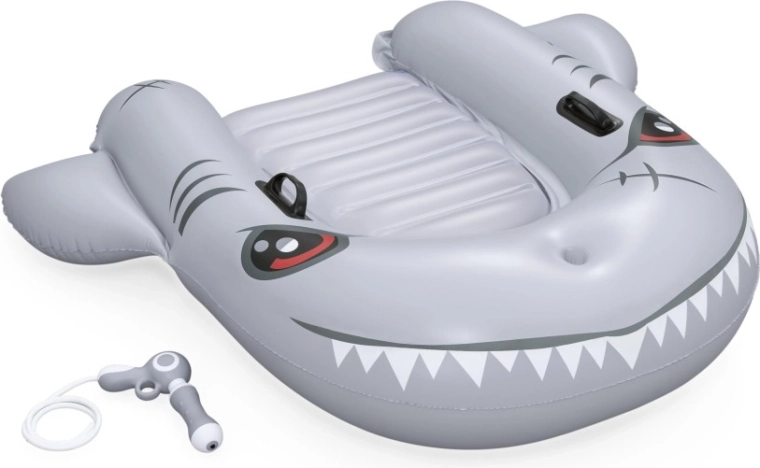 L’embarcation gonflable en forme de requin apporte une dose de fun et de confort à la piscine. Son design gris argenté réaliste avec yeux et dents attire le regard, tandis que l’assise nervurée et les bords relevés assurent une position stable et confortable. Deux poignées solides aident les enfants à garder l’équilibre et à manœuvrer facilement.