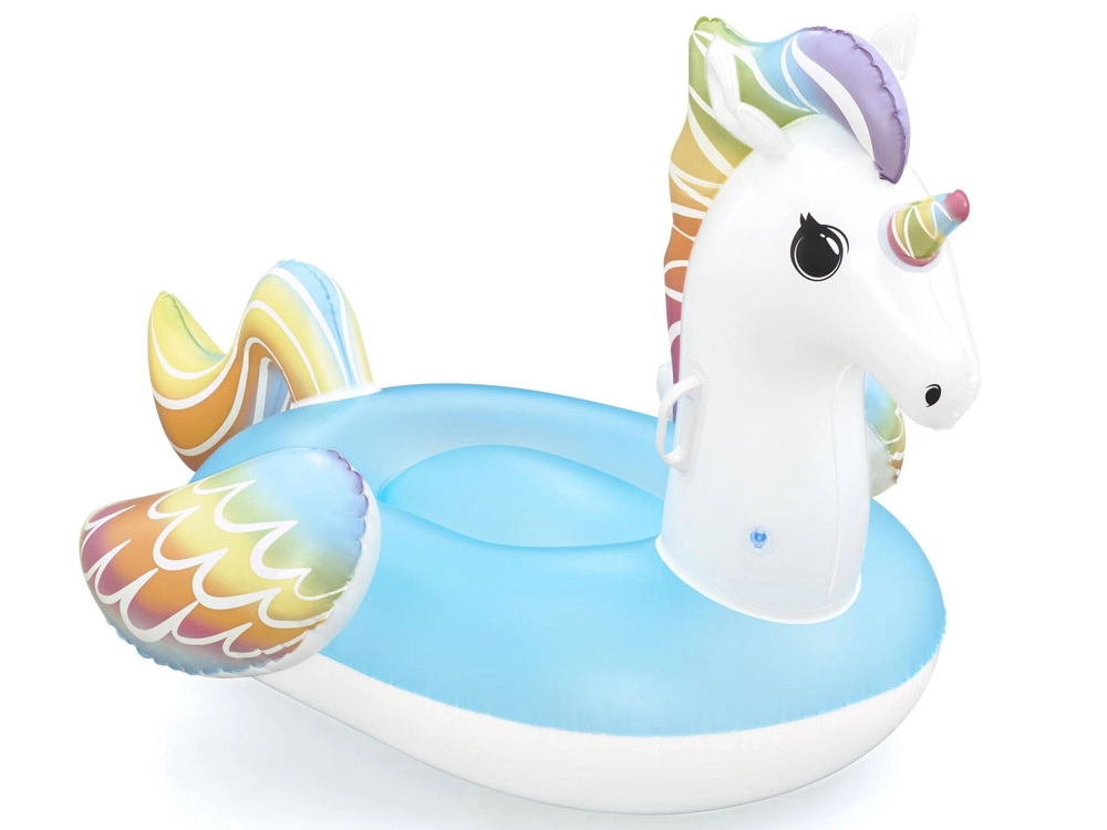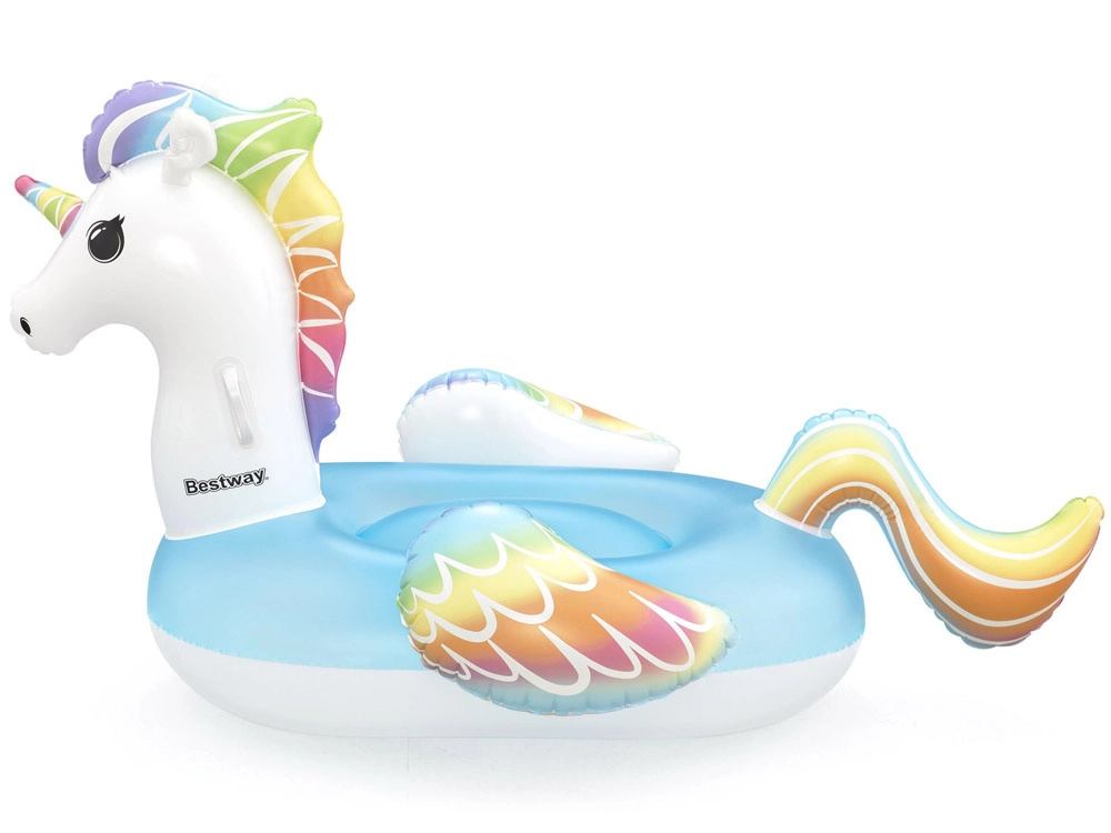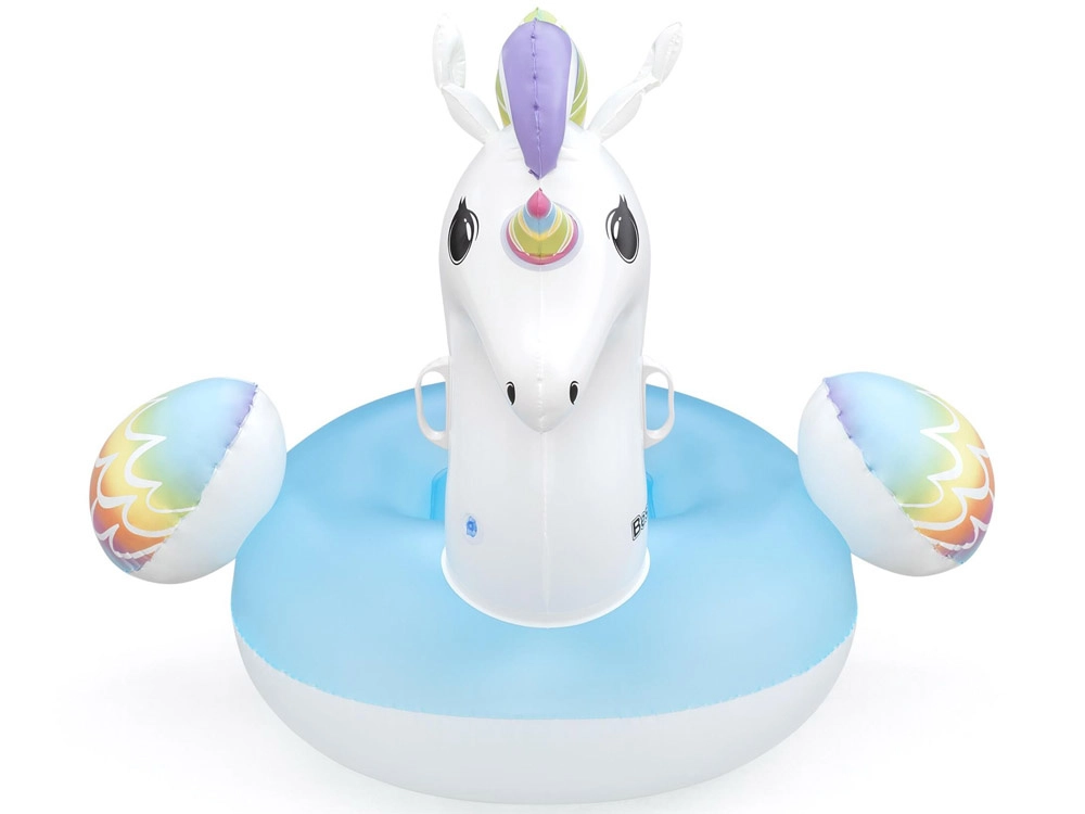 Des ailes colorées, une crinière et une queue arc-en-ciel attirent le regard dès le premier coup d’œil. Le siège spacieux et les poignées font de cette bouée un compagnon favori pour la piscine.