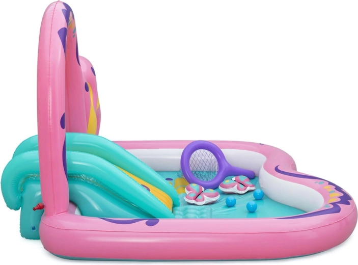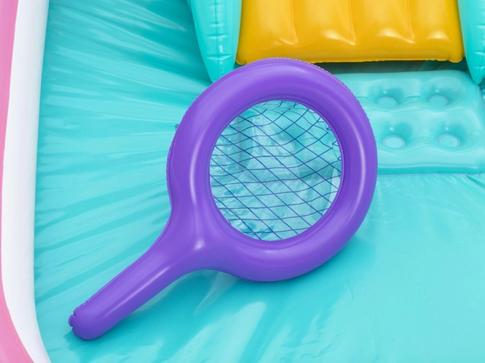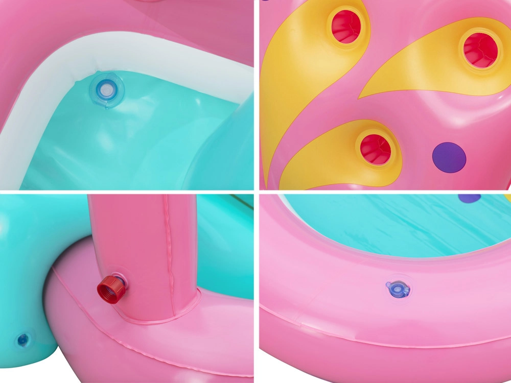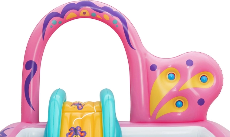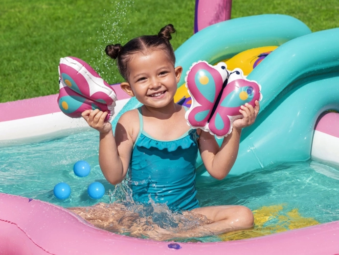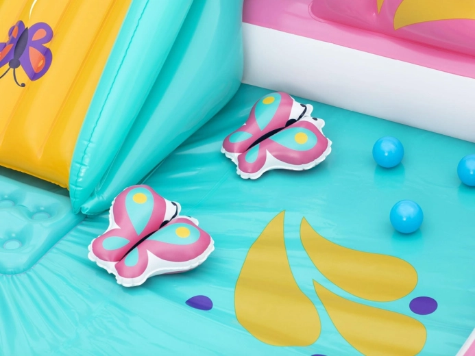 Des jouets flottants ludiques et des éléments gonflables en forme de papillons et d’anneaux sont inclus. Les parois souples et les réceptions matelassées augmentent le confort et la sécurité. Le vinyle résistant se nettoie facilement et la rustine de réparation fournie prolonge la durée de vie. Il suffit de raccorder le tuyau, de gonfler et le jeu peut commencer.