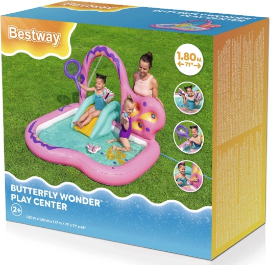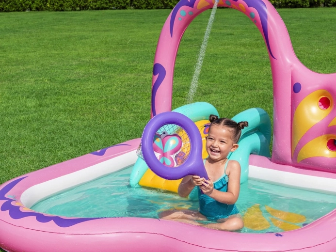 Le centre de jeu aquatique gonflable Bestway Papillon transforme le jardin en un lieu sûr et joyeux. Grâce à ses dimensions compactes 180 × 180 × 117 cm, il s’intègre même aux petits espaces, tout en offrant de nombreuses activités : glissade vers une zone peu profonde pour barboter, douche en arceau raccordée au tuyau d’arrosage et ouvertures pour lancer et trier les balles qui développent la motricité fine.