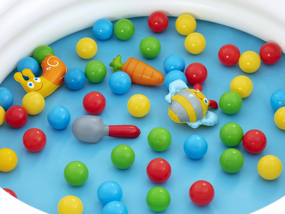 Le set comprend 46 balles colorées et 4 balles ouvrables avec des jouets à l’intérieur, qui stimulent la curiosité, la motricité fine et le jeu créatif.