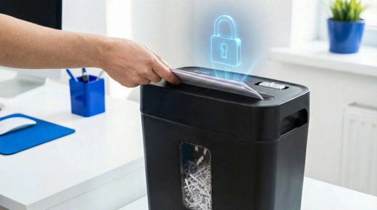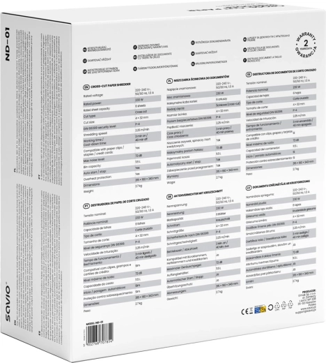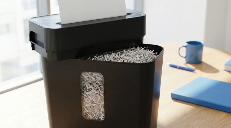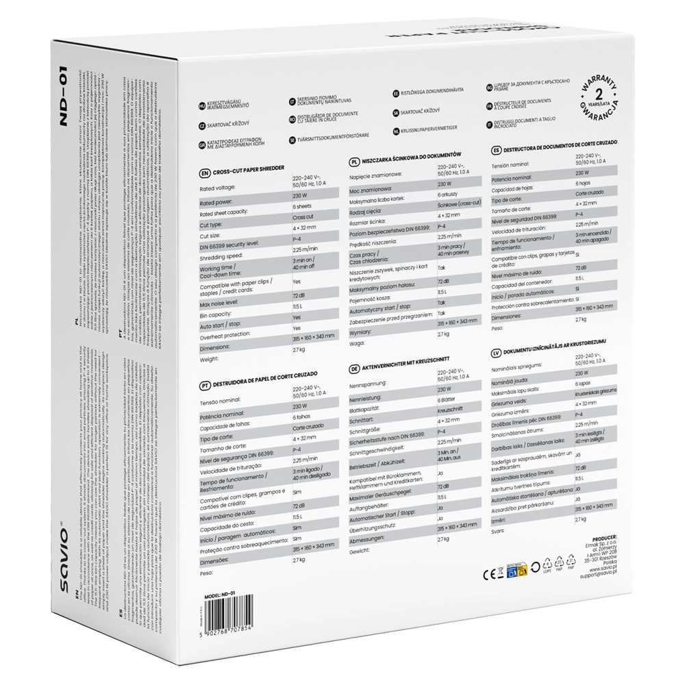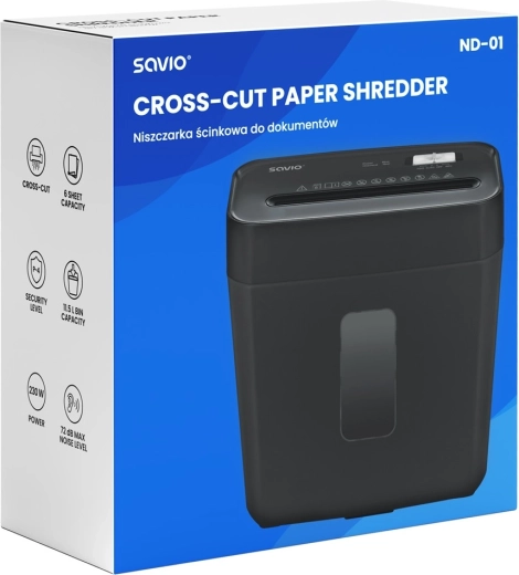 Le destructeur compact ND-01 protège votre vie privée grâce à la coupe croisée 4 × 32 mm et à la classe de sécurité P-4. Il peut traiter jusqu’à 6 feuilles à la fois, gère les trombones, agrafes et cartes de paiement, dispose d’un réservoir de 11,5 l et d’un fonctionnement silencieux autour de 72 dB – idéal pour la maison et les petits bureaux.