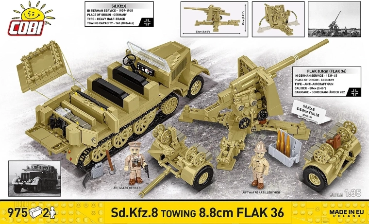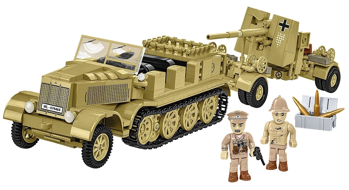 Construisez l’emblématique combinaison d’artillerie du désert du DAK : le robuste tracteur semi-chenillé Sd.Kfz. 8 avec le canon remorqué 8,8 cm Flak 36. Obtenez un modèle réaliste à l’échelle 1:35, avec 975 pièces, 2 figurines et de nombreux éléments mobiles pour des scènes d’action et des dioramas de la campagne en Afrique du Nord. Haute qualité de fabrication, marquages durables et notice intuitive raviront collectionneurs et constructeurs passionnés.