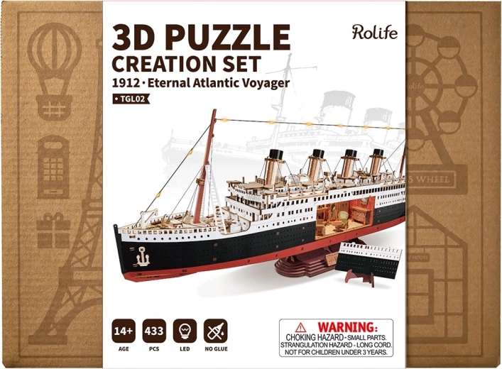 Ce kit DIY design propose un modèle réaliste d’un paquebot légendaire avec des proportions exactes, quatre cheminées et des ponts richement détaillés. Grâce au panneau latéral amovible, vous pouvez observer les cabines et les couloirs, tandis que le léger chaud des LED met en valeur les détails intérieurs et extérieurs. Une fois terminé, le modèle devient une décoration élégante pour le salon, le bureau ou la chambre d’étudiant.