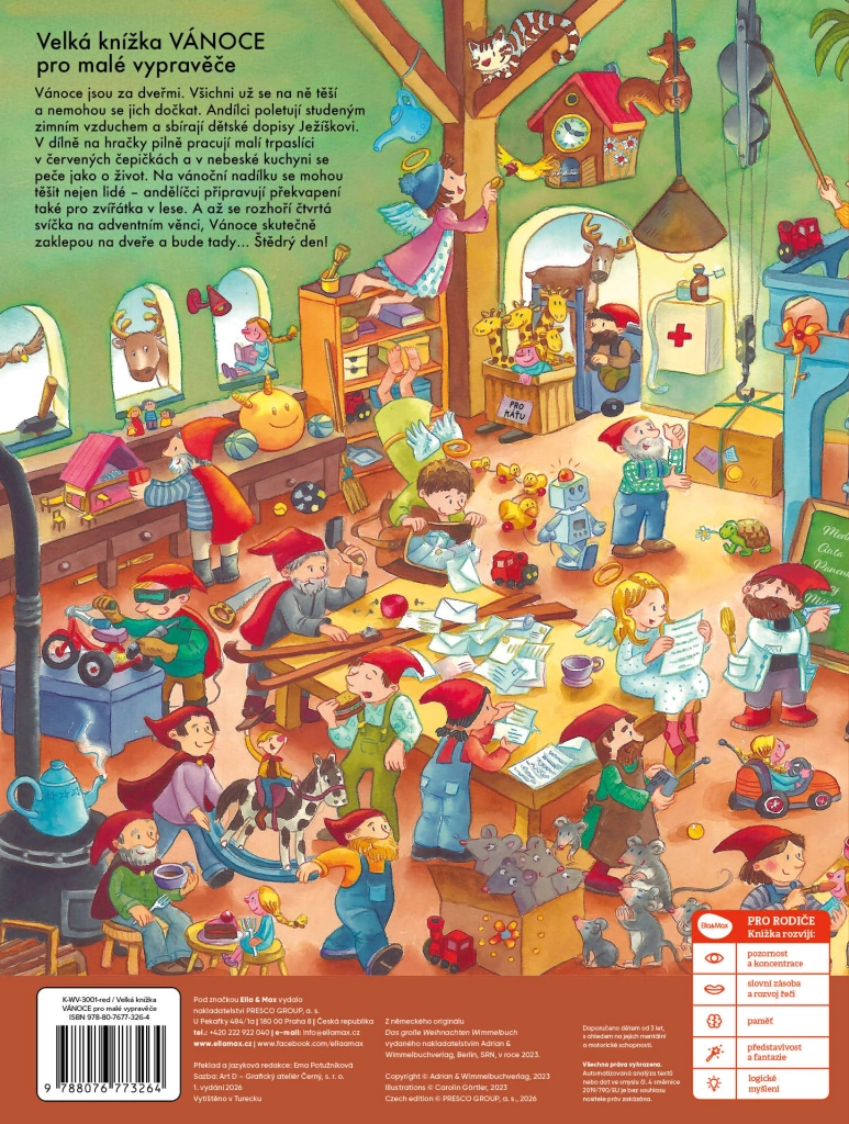 Parcourez l’atelier des lutins, observez les anges qui recueillent les lettres destinées à l’Enfant Jésus, et jetez un œil à la cuisine céleste où l’on s’affaire à pâtisser. Les animaux de la forêt ne sont pas oubliés – une surprise les attend eux aussi. Grâce au grand format et à des consignes claires, ce livre est idéal pour les préadolescents et les jeunes enfants d’âge scolaire.