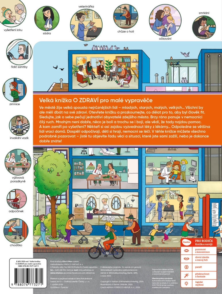 Ce grand album invite les enfants à explorer une ville animée où chacun prend soin de sa santé – du tumulte matinal à l’hôpital jusqu’aux retours à la maison l’après-midi. Les enfants découvrent les cabinets médicaux, les salles d’attente et les pharmacies, et comprennent que, même si l’on a parfois peur, on trouve de l’aide dans les établissements de santé.