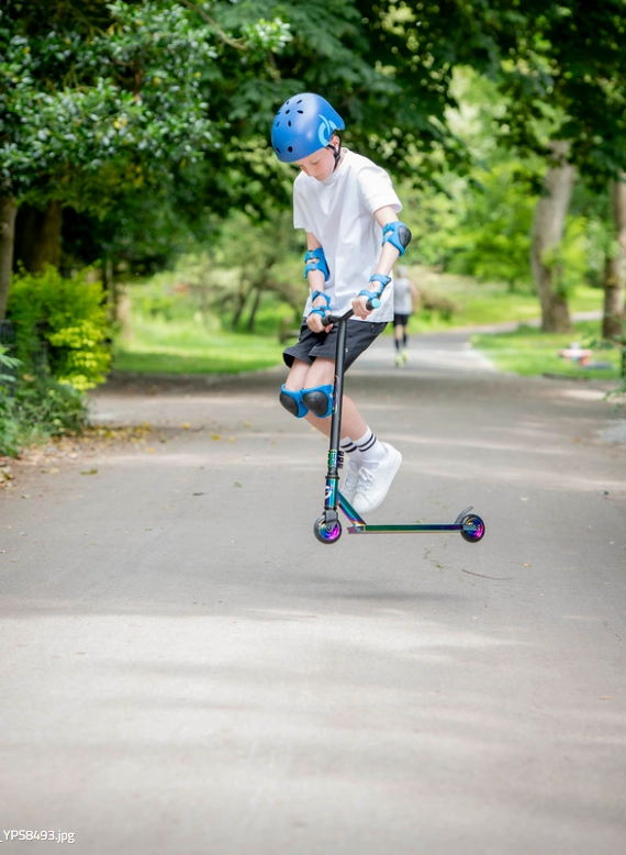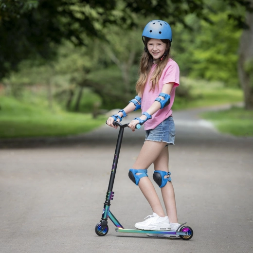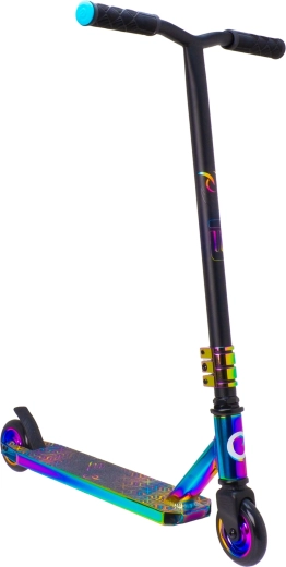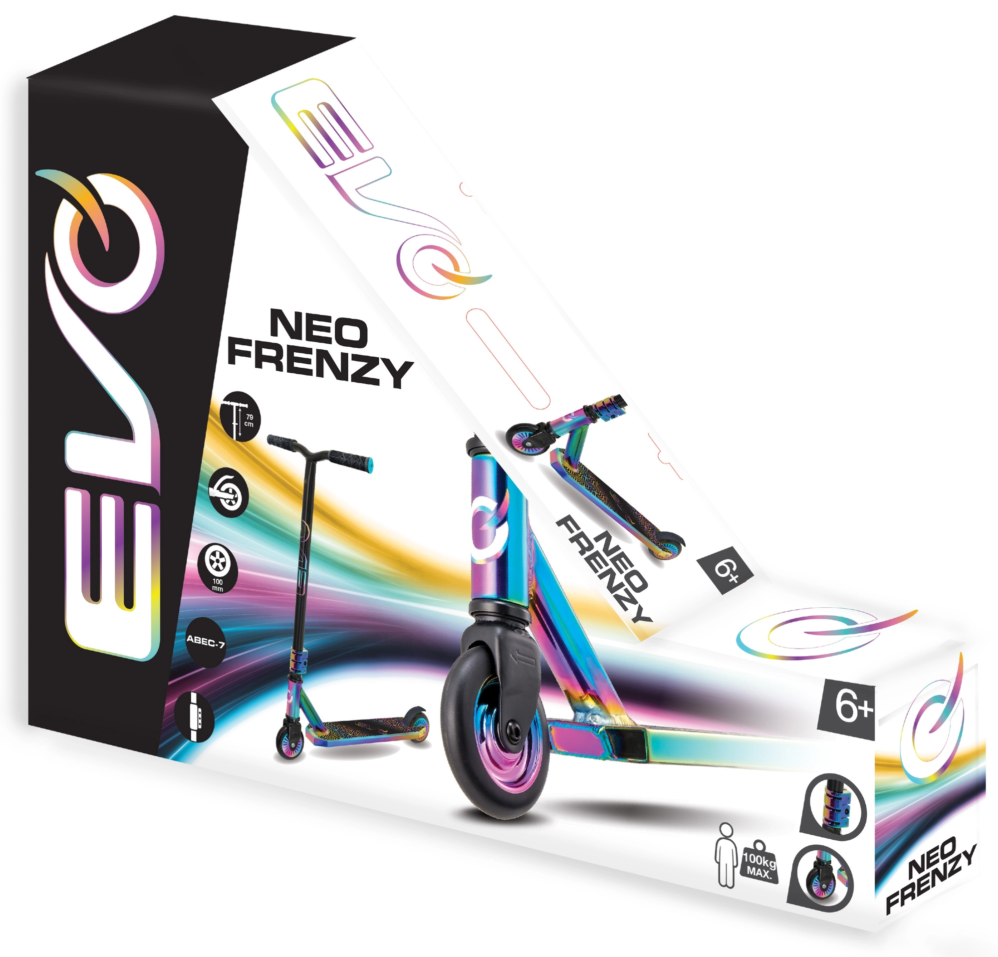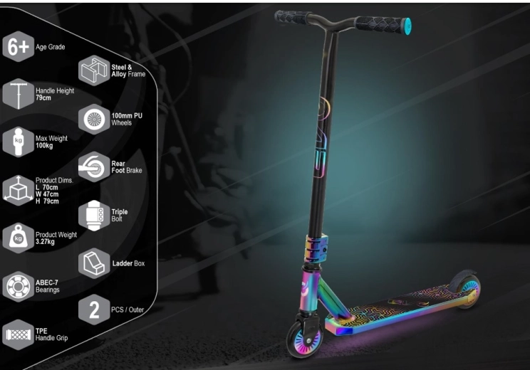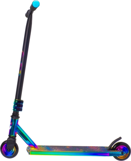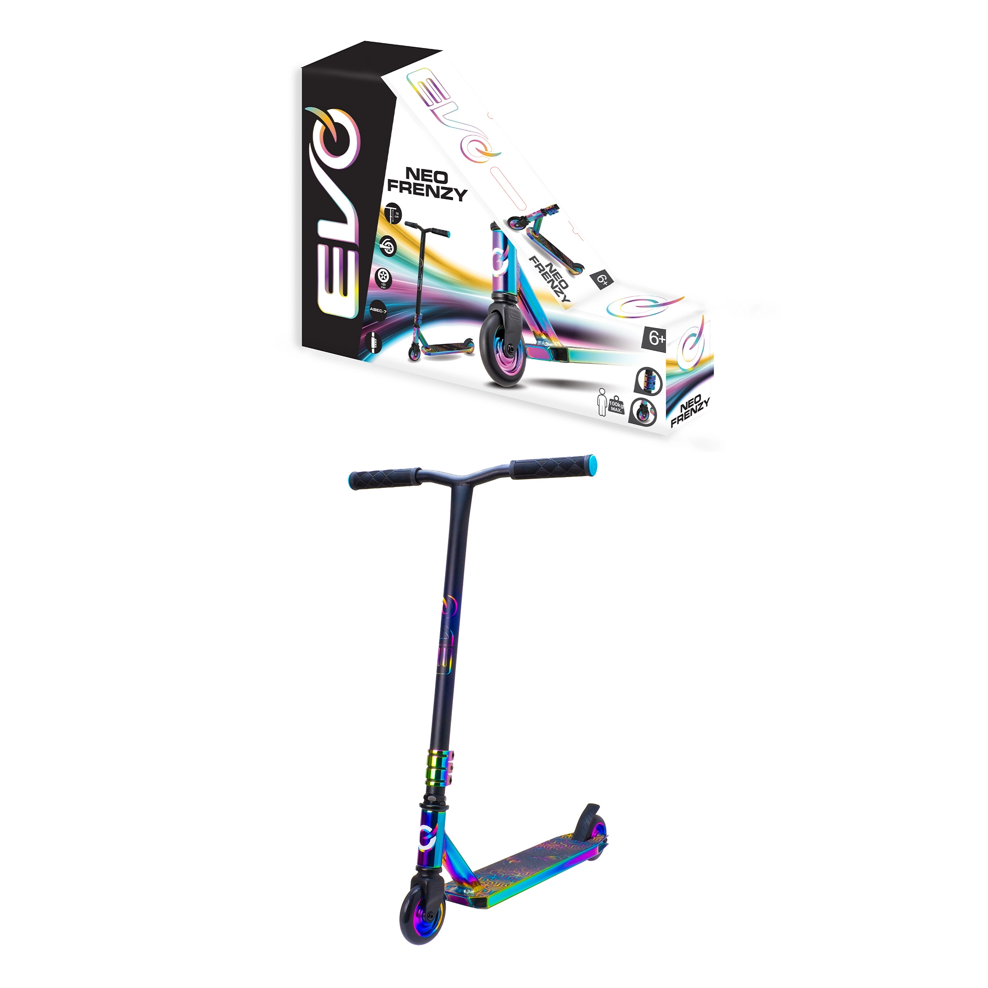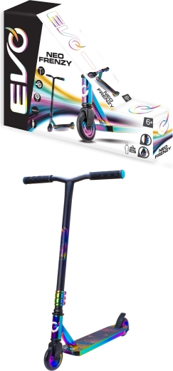 La trottinette freestyle EVO Neo Frenzy pour enfants dès 6 ans offre une construction robuste pour les figures, une glisse fluide grâce aux roulements ABEC-7 et un look néo-chrome irisé accrocheur. Elle est équipée d’un guidon en T avec poignées confortables, d’un frein arrière à pédale et d’un noyau de roues en métal pour plus de stabilité et de confiance au skatepark comme en ville.
