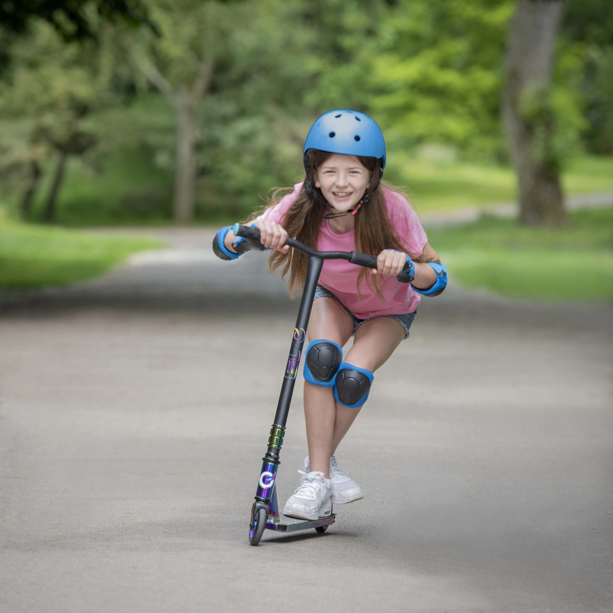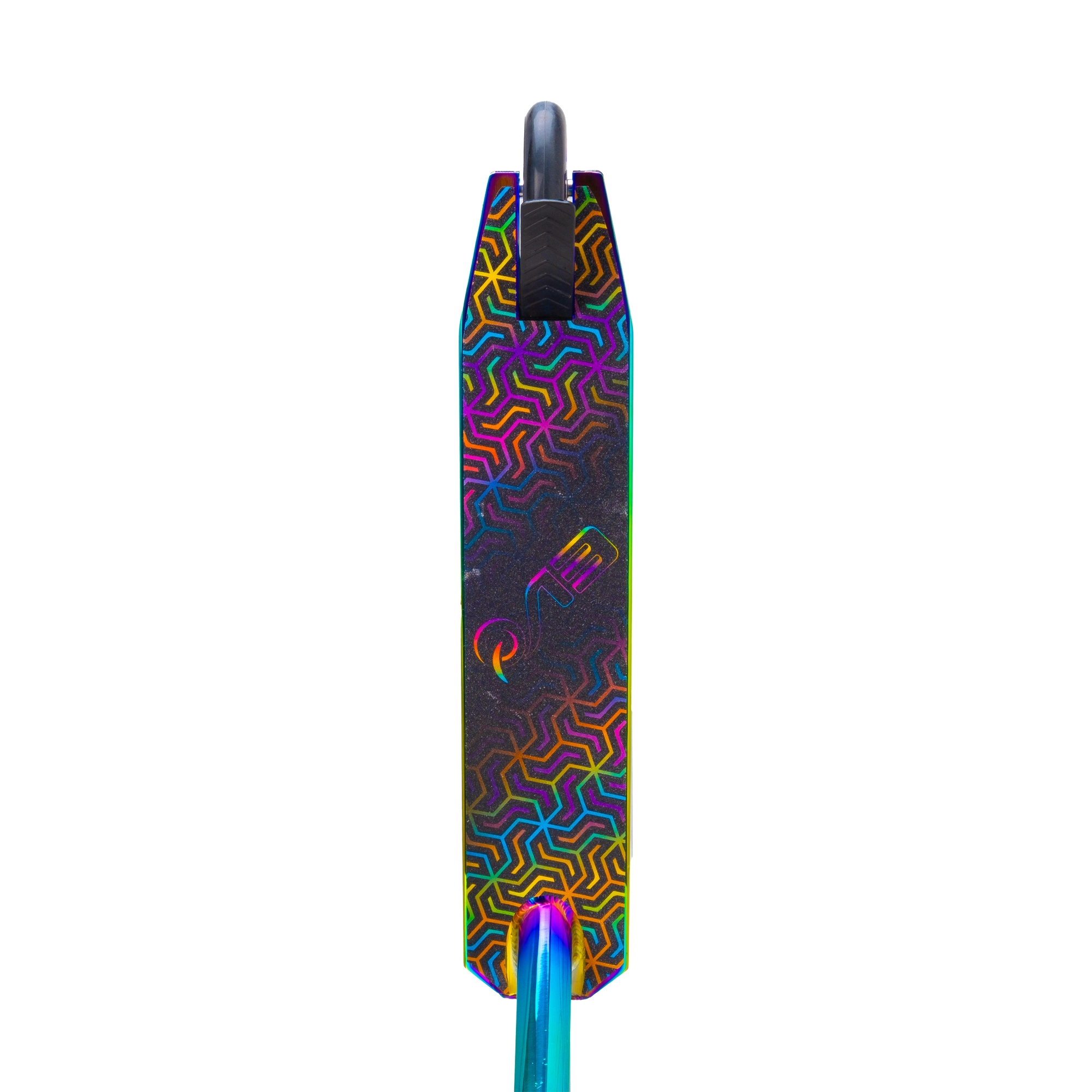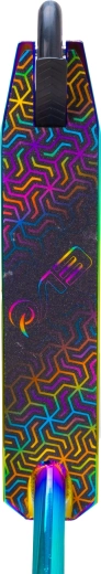 Finition irisée (arc‑en‑ciel) sur le deck, la fourche et le collier, offrant un look unique qui donne envie de rouler.