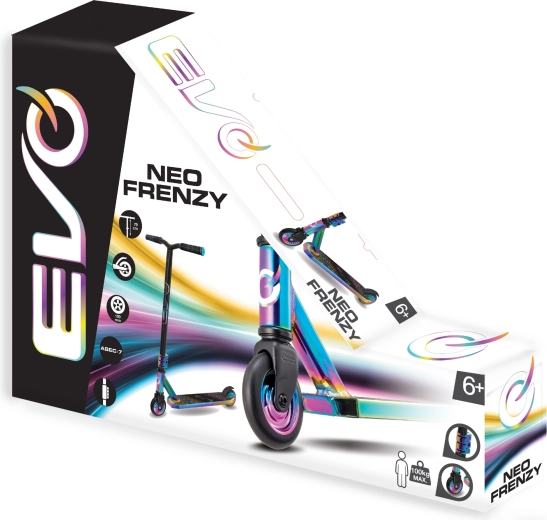 EVO Neo Frenzy est une trottinette « stunt » pour enfants conçue pour apprendre l’équilibre et les premières figures. Son deck métallique robuste avec ruban grip antidérapant et sa fourche résistante assurent la stabilité, tandis que les petites roues dures avec roulements ABEC-7 offrent des accélérations vives et une conduite fluide. Les détails néo‑chrome accrocheurs attirent le regard et confèrent un style unique.