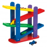 Un circuit de voitures en bois avec trois petites voitures colorées offre un divertissement sans fin grâce au retournement facile sur des pistes en cascades colorées.