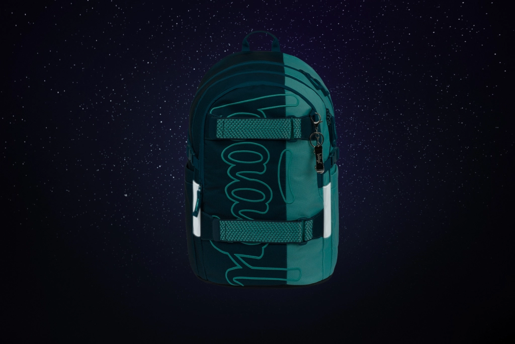 Ensemble scolaire BAAGL assorti avec style pour élèves et étudiants, comprenant un léger sac à dos Skate avec fixation pour skateboard, une trousse spacieuse et un sac de sport pliable Hoop. Le tout en matériaux recyclés et déperlants certifiés GRS, avec des éléments réfléchissants et des fermetures à glissière YKK fiables.