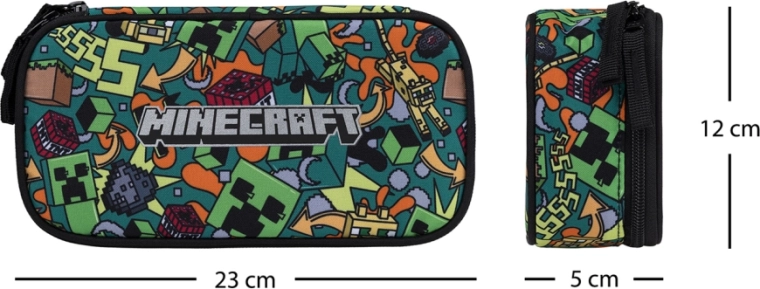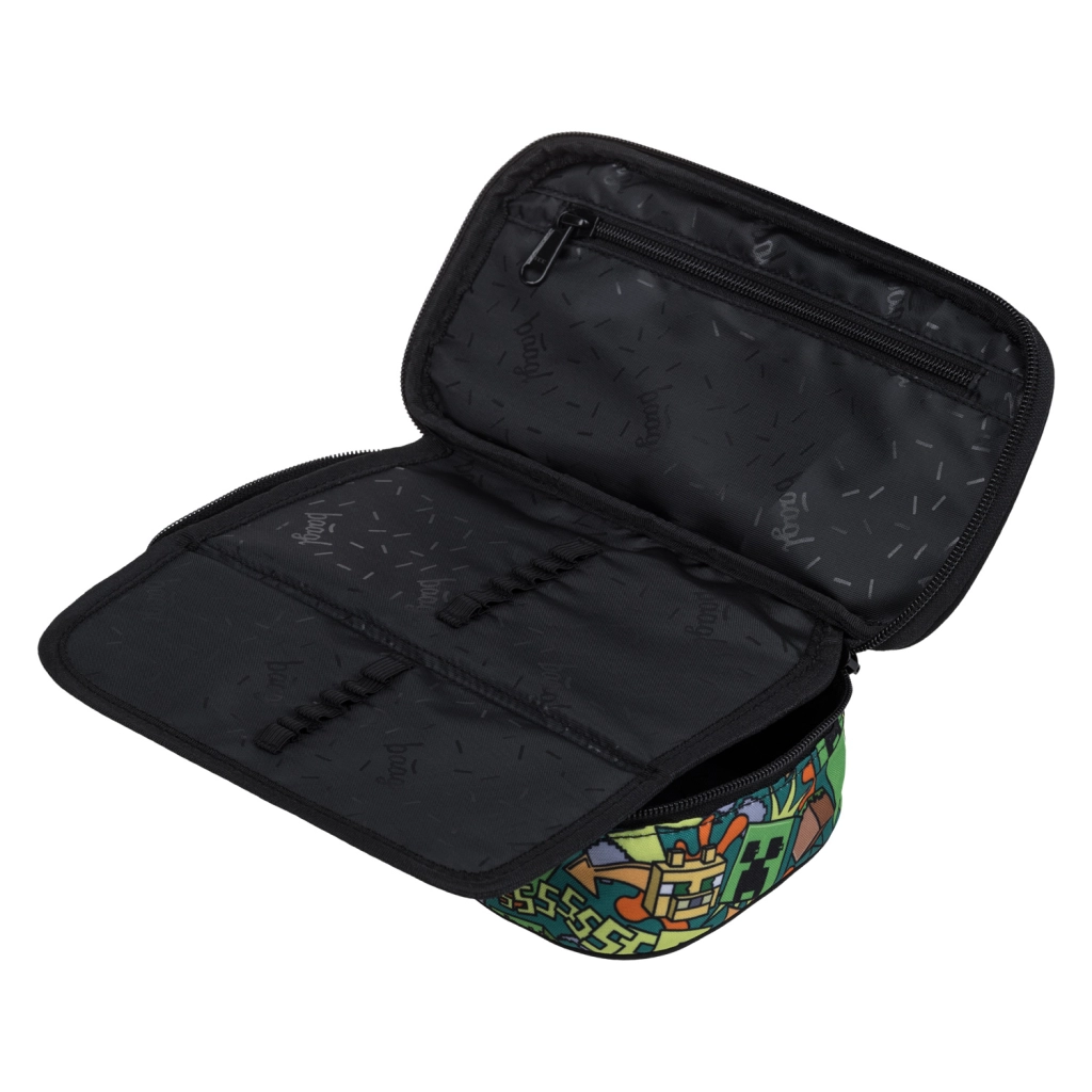 Trousse scolaire étui BAAGL élégante et résistante avec le motif MINECRAFT Chaos, offrant une grande compartimentation principale, un rabattable double, une poche intérieure et une fenêtre pour l’emploi du temps. Grâce aux fermetures éclair YKK de marque et au matériau recyclé robuste, c’est un choix idéal pour une utilisation quotidienne. Trousse fournie sans contenu.