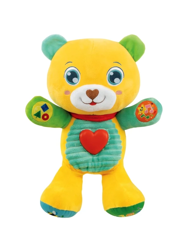 Grâce à ses 5 boutons tactiles, l’enfant apprend à reconnaître les lettres, chiffres, couleurs et formes. Le cœur lumineux s’illumine lorsque l’ours parle ou chante des chansons et comptines joyeuses, ce qui stimule les sens, le sens du rythme et la motricité fine.