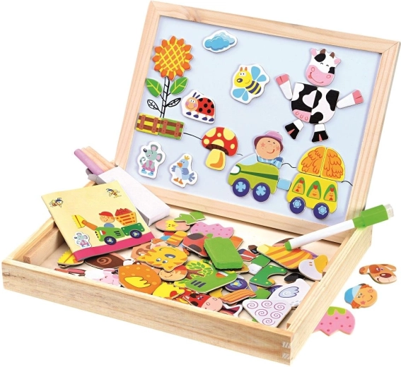 Tous ces outils créatifs et pièces sont rangés dans une boîte en bois qui est facilement transportable. Les enfants s'amuseront pendant des heures avec ce tableau sur le thème de la ferme, tout en développant leur imagination et leurs compétences.