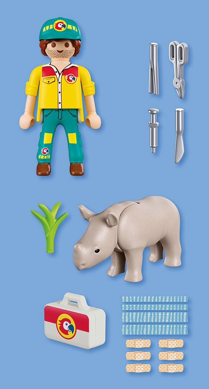Figurine de soigneur, figurine de rhinocéros, mallette médicale, set d’instruments médicaux, planche d’autocollants avec pansements et bandages, élément de plante