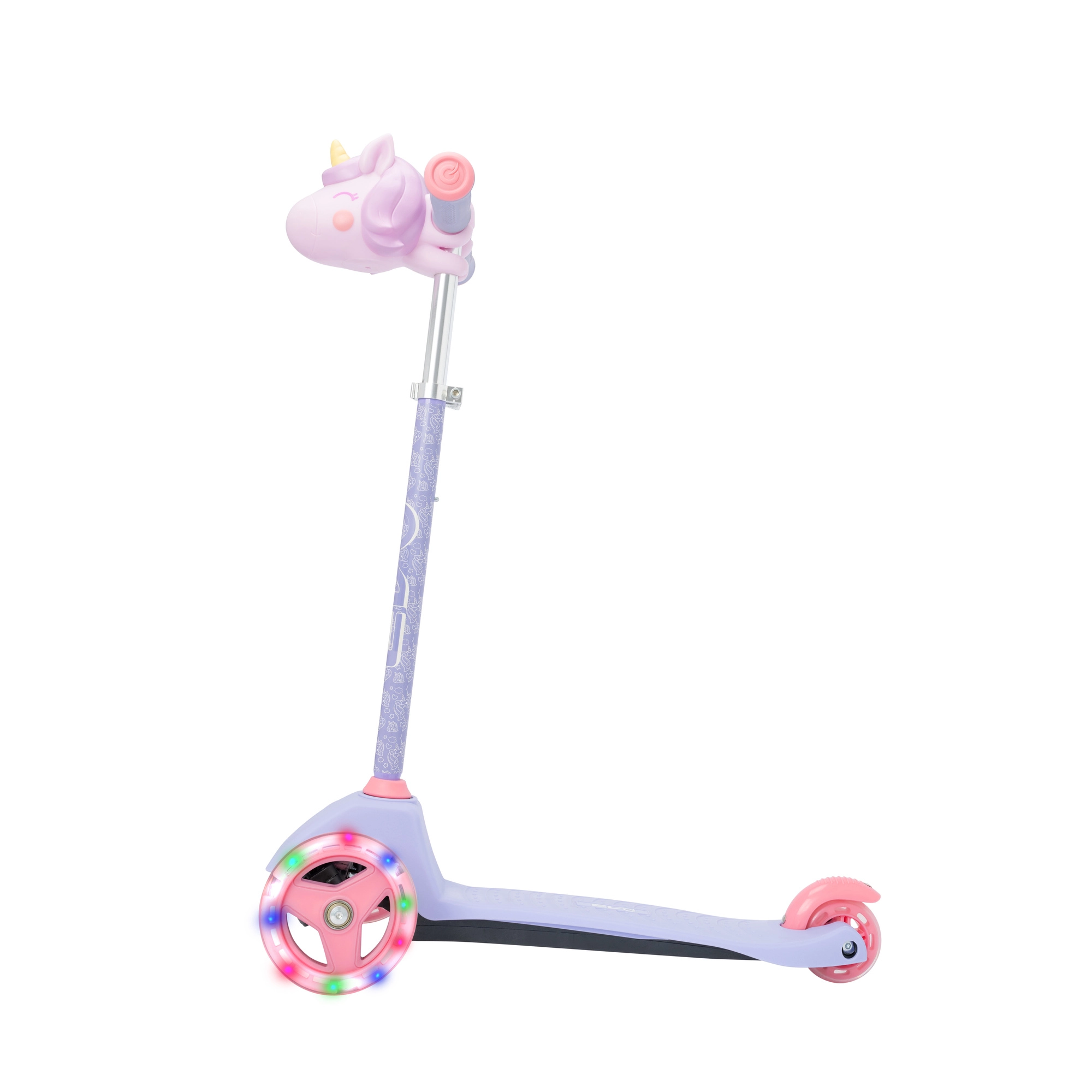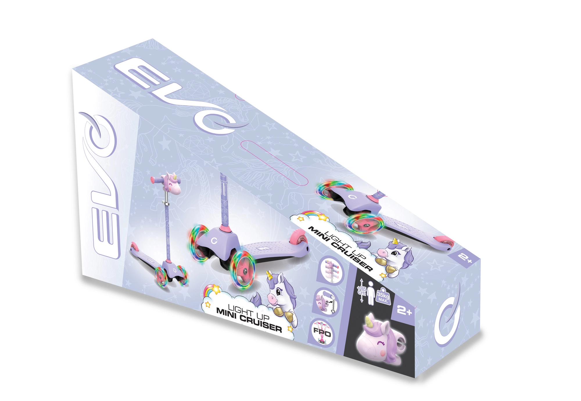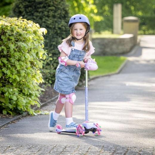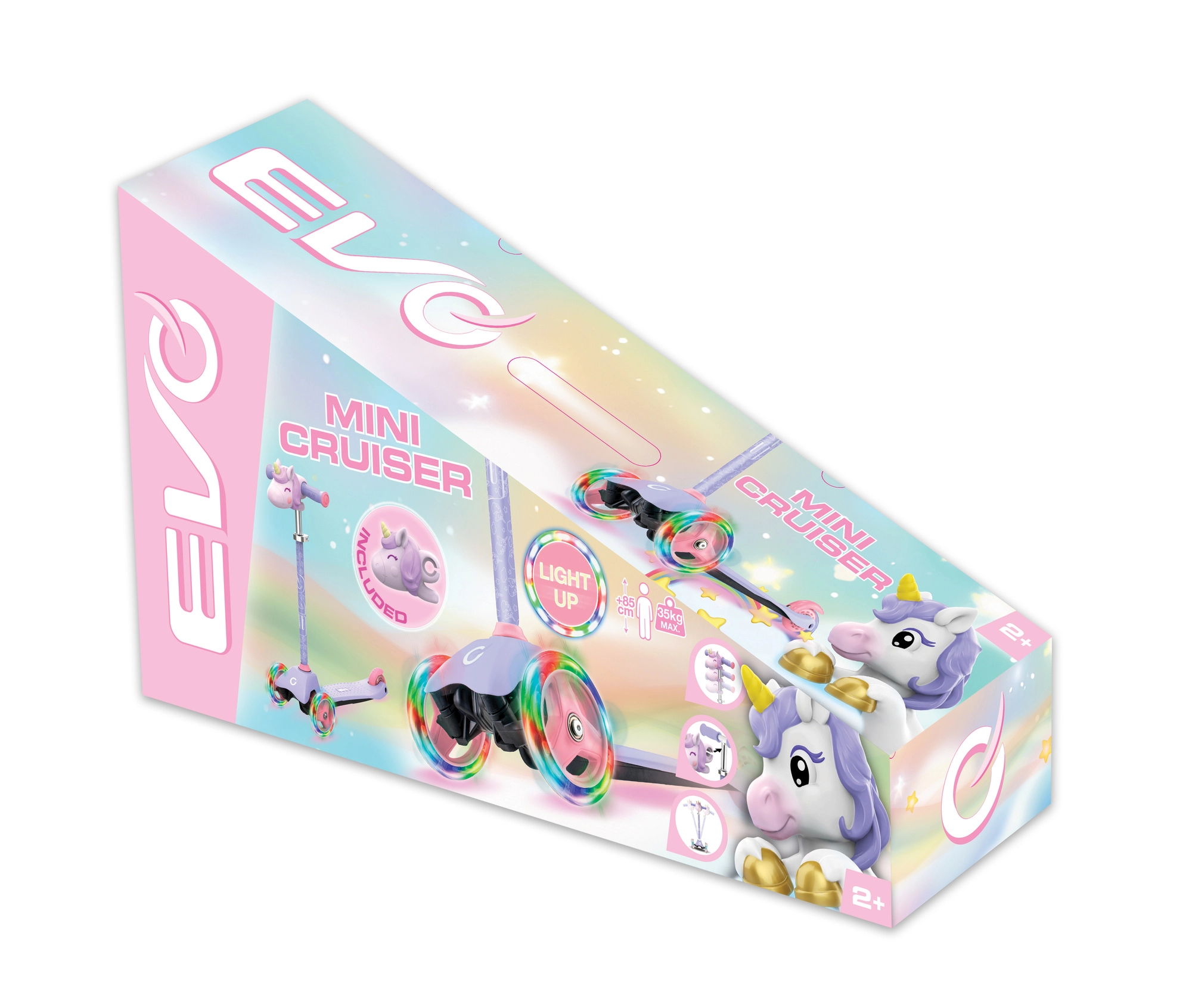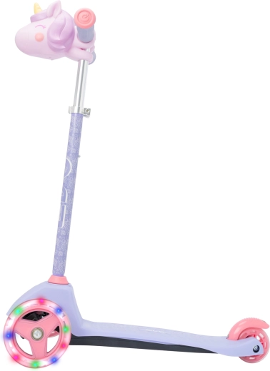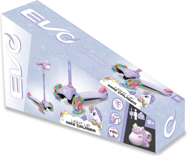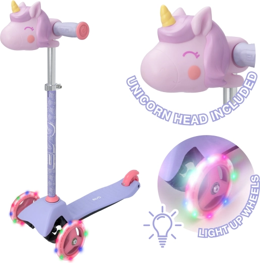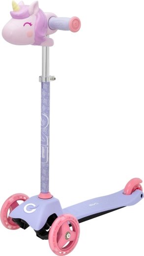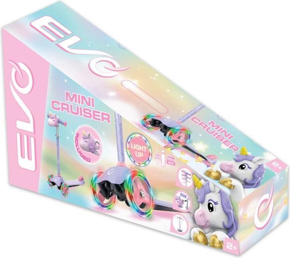 La trottinette tricycle pour enfants EVO Light Up Mini Cruiser au motif licorne ravira les petits riders dès 2 ans. Elle offre trois roues stables, un plateau large et bas, un guidon réglable et des roues avant lumineuses pour des sorties encore plus fun. Grâce à la direction par inclinaison, elle développe l’équilibre et la coordination, tandis que le frein arrière au pied assure un arrêt en toute sécurité.