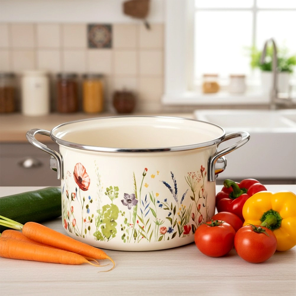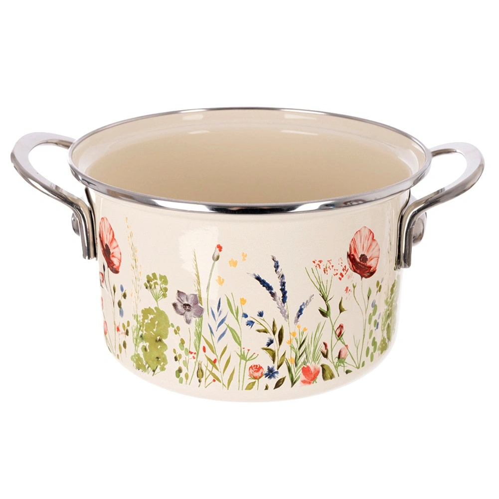 Découvrez le charme intemporel du design rétro allié à la praticité. La casserole émaillée de couleur crème avec motif de fleurs des prés deviendra l’ornement de toute cuisine. Grâce à l’acier émaillé de qualité, elle diffuse parfaitement la chaleur, est résistante et facile à nettoyer. Le bord en inox et les poignées latérales robustes assurent une manipulation sûre.
