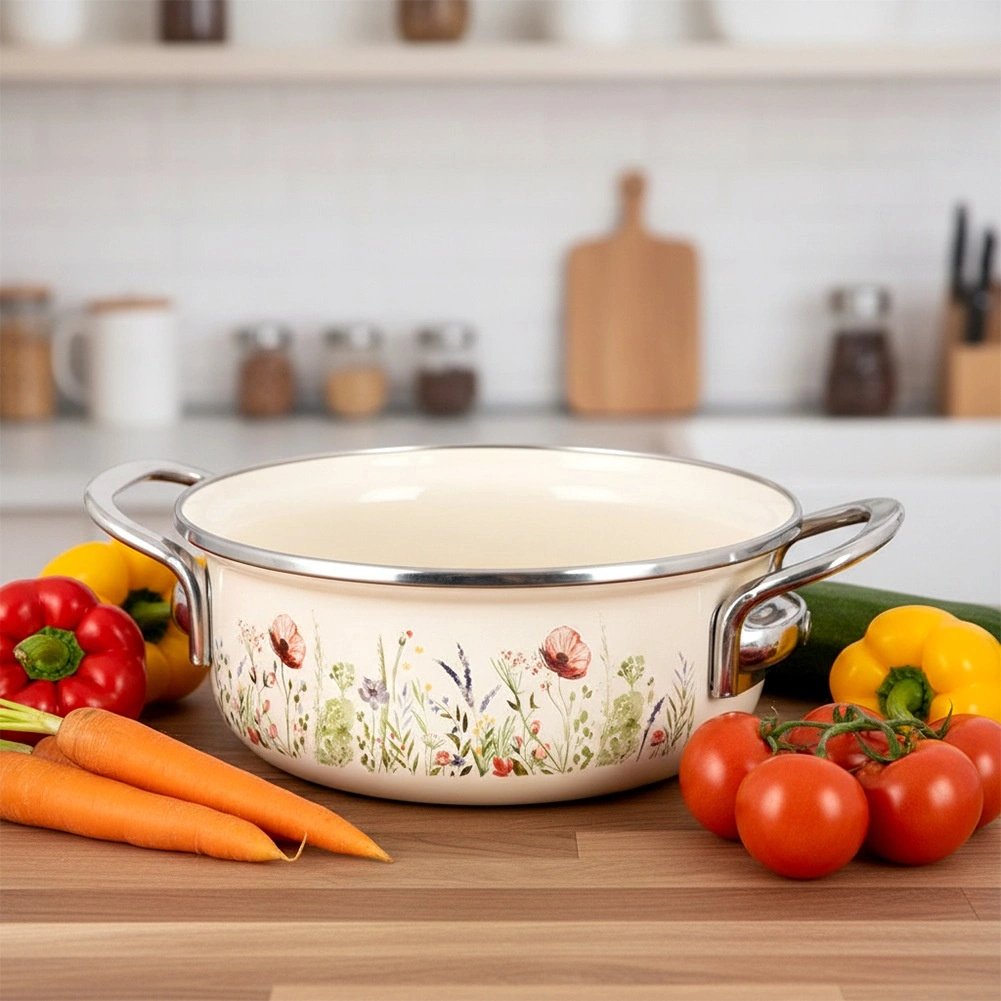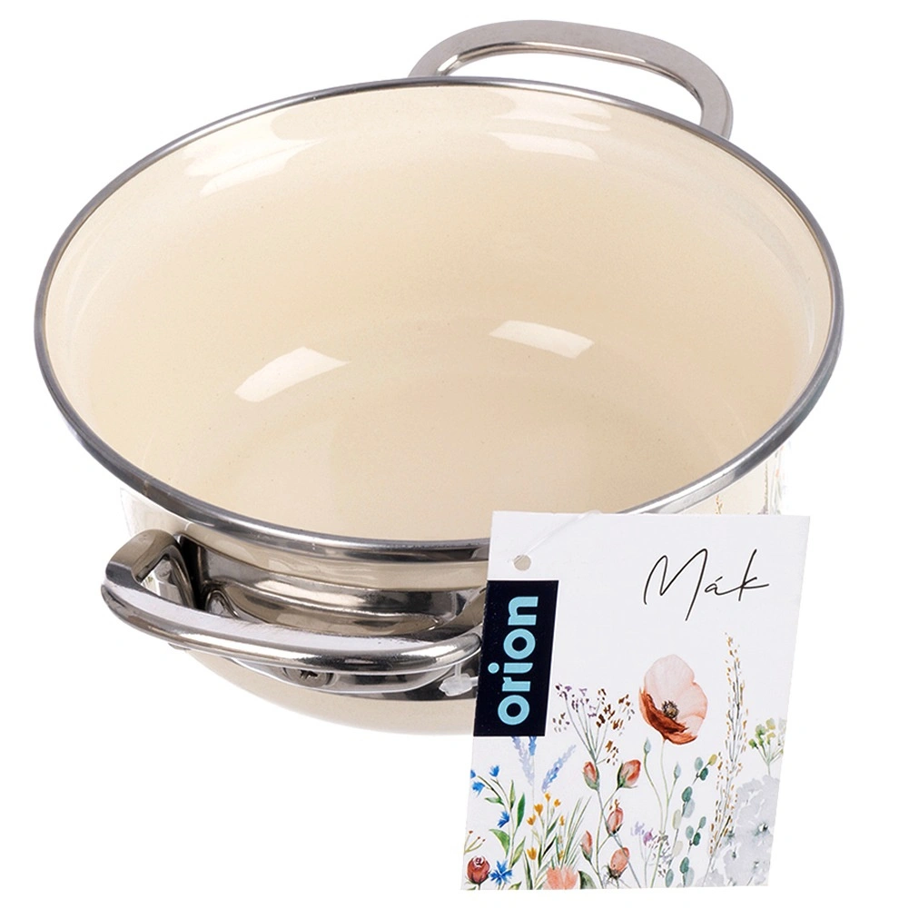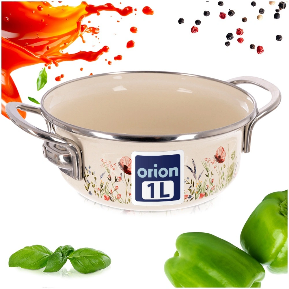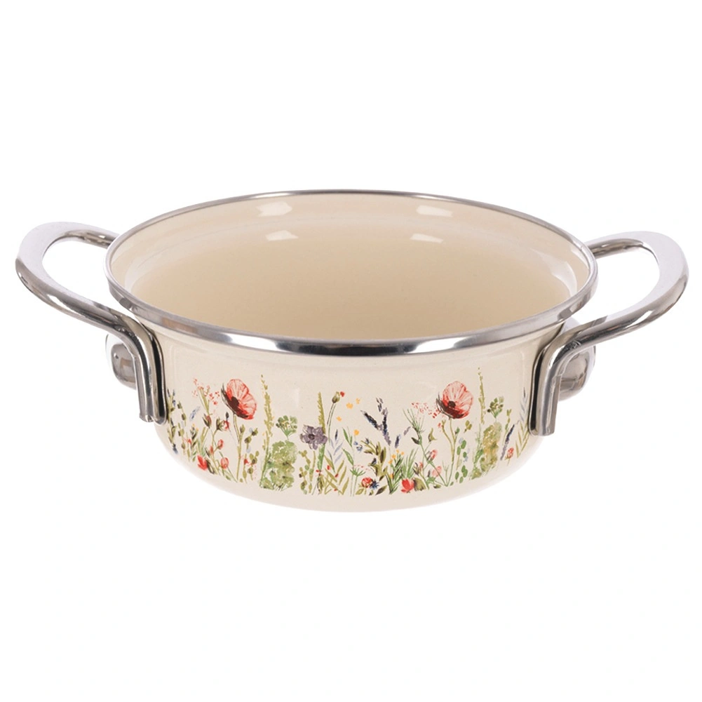 Look traditionnel, fonctionnalité moderne. Cette casserole crème avec surface émaillée et bord en inox diffuse parfaitement la chaleur, résiste à la corrosion et se nettoie facilement. Le décor de fleurs des prés apporte une touche rétro à votre cuisine, tandis que sa capacité pratique de 950 ml est idéale pour les sauces, soupes ou portions rapides pour une à deux personnes.