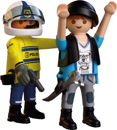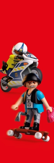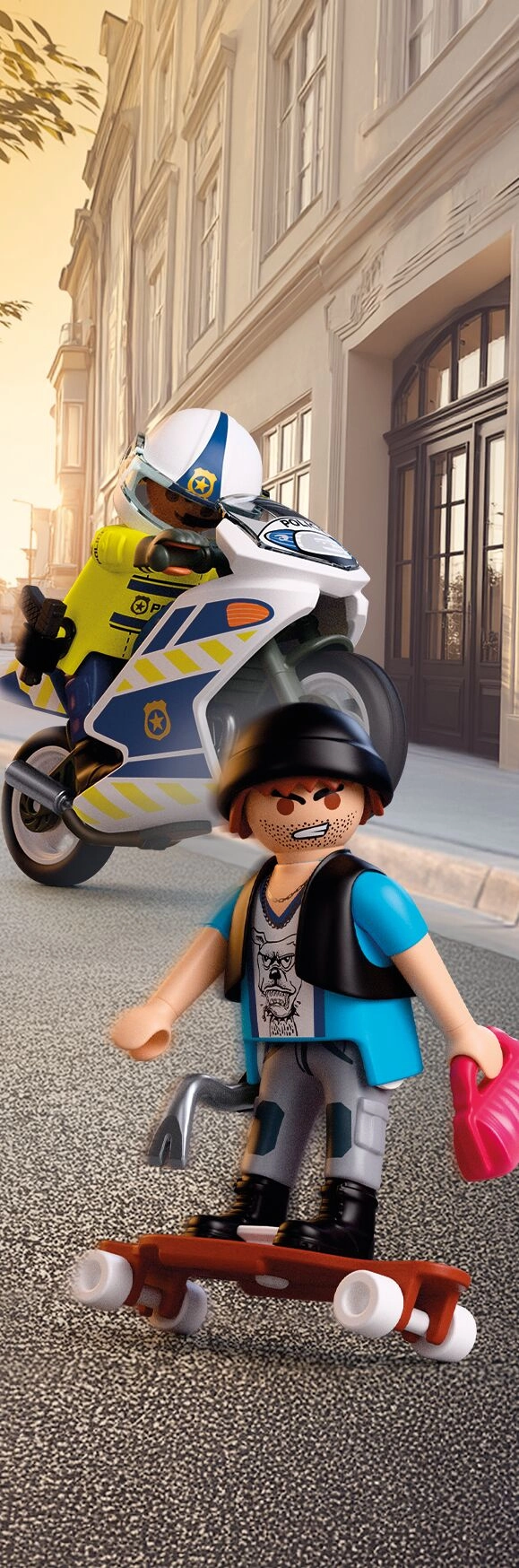 • Contenu du set : 2 figurines (policier et voleur, env. 7,5 cm), moto de police, skateboard/longboard, casque, gants, étui, pistolet, casquette, sac à main, support et pied-de-biche.