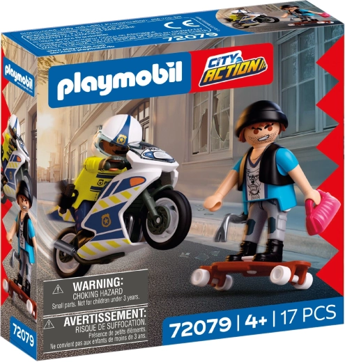 Lancez une action palpitante en ville avec le set de jeu PLAYMOBIL City Action. Un policier à moto poursuit un voleur sur skateboard et tente de récupérer le sac à main volé. Le set comprend 2 figurines, une moto de police, un longboard/skateboard et de nombreux accessoires authentiques pour un jeu de rôle réaliste.