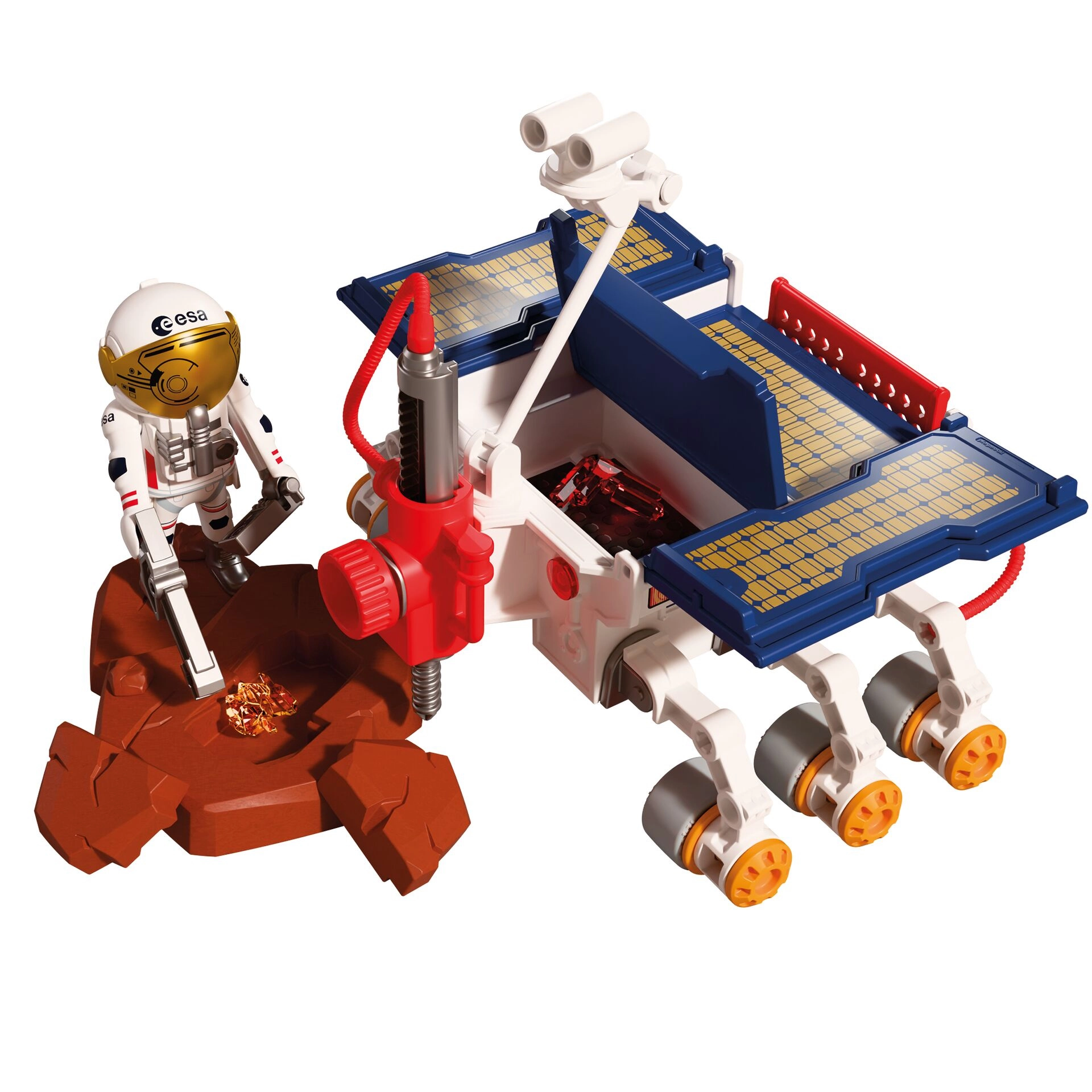 Explorez la planète rouge avec un set PLAYMOBIL réaliste créé en collaboration avec la Agence spatiale européenne (ESA). Le rover martien robuste avec module de forage, caméras, capteurs et panneaux solaires rabattables permet aux enfants d’explorer le terrain, de collecter des échantillons et de vivre une expédition scientifique authentique. Des éléments mobiles et des accessoires fonctionnels favorisent le jeu de rôle créatif et stimulent l’imagination.