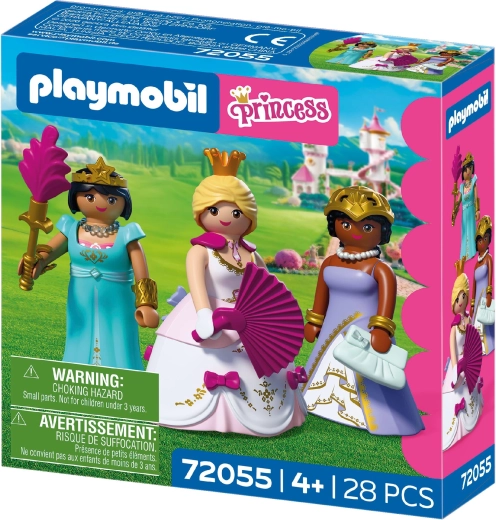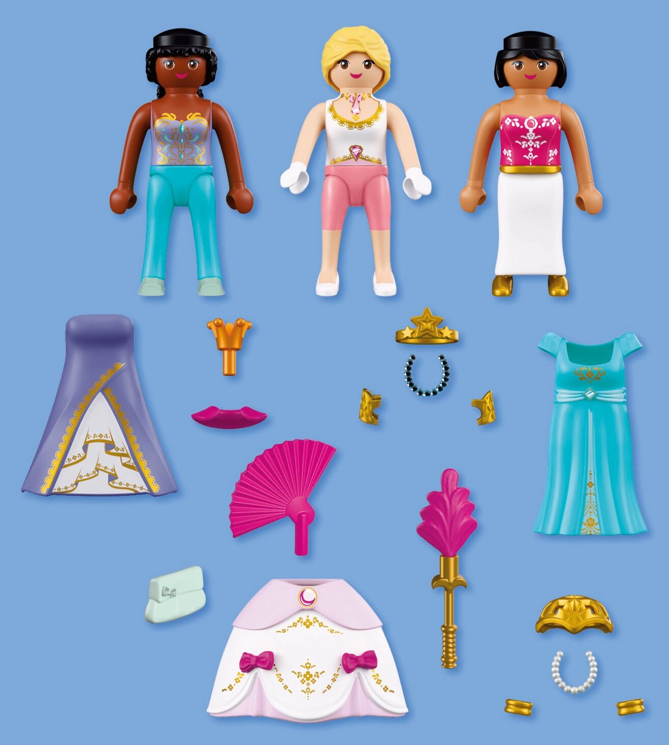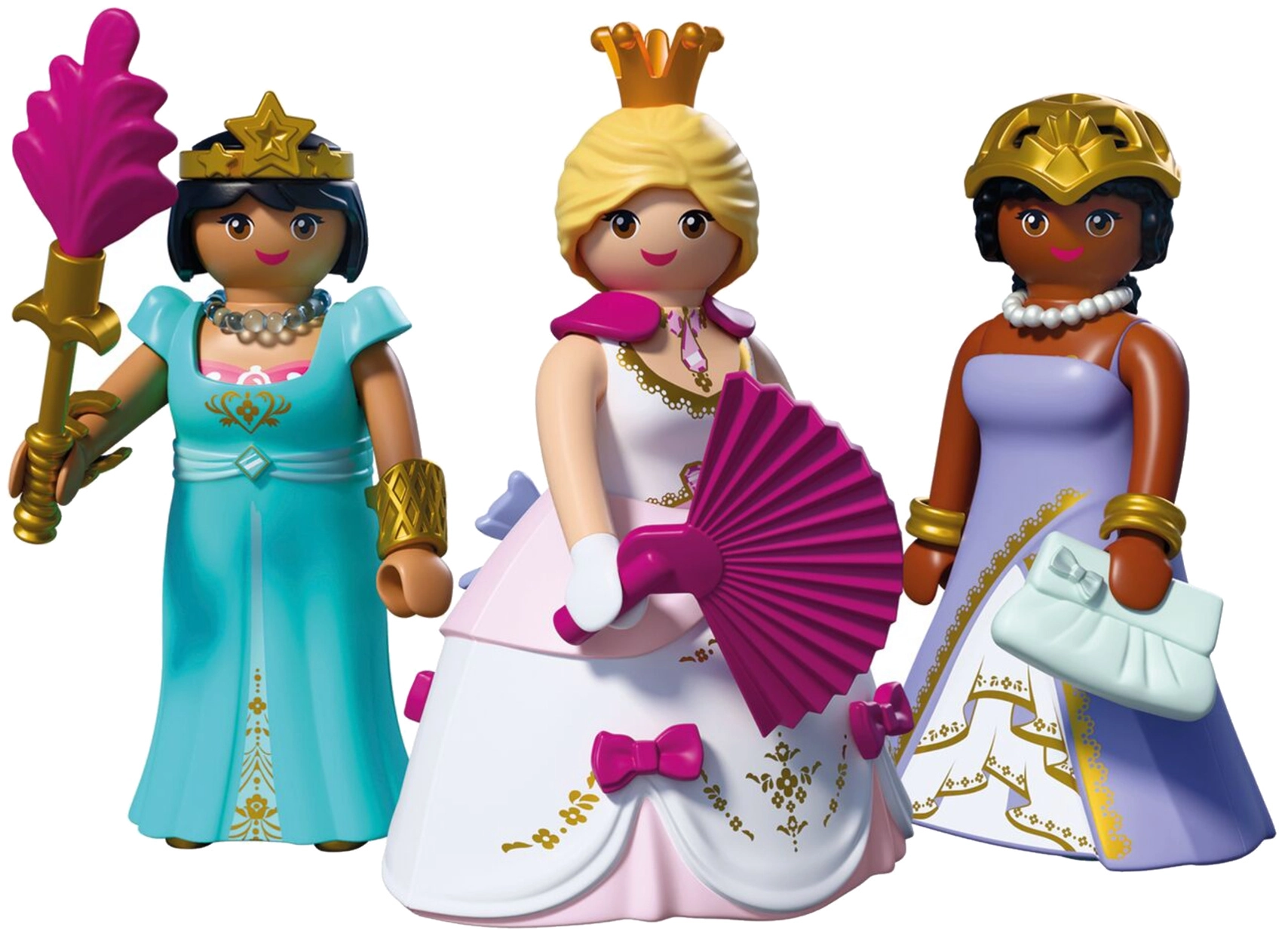 - Contenu de la boîte : 3 figurines de princesses (env. 7,5 cm), 2 robes, jupe, couronne, couronne avec étoile, résille pour cheveux, éventail, col, 2 colliers, sceptre avec plume, 2 bracelets, 2 manchettes
