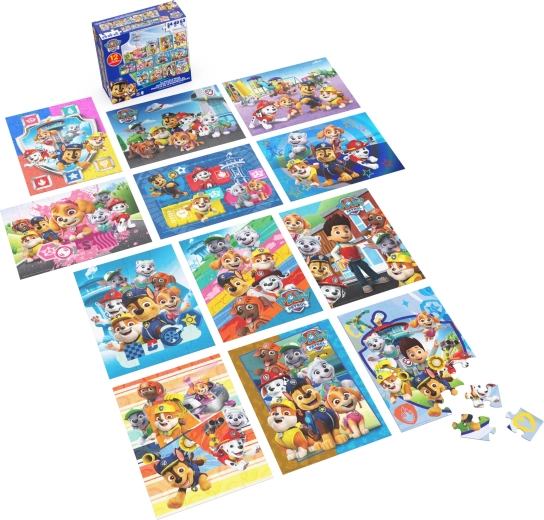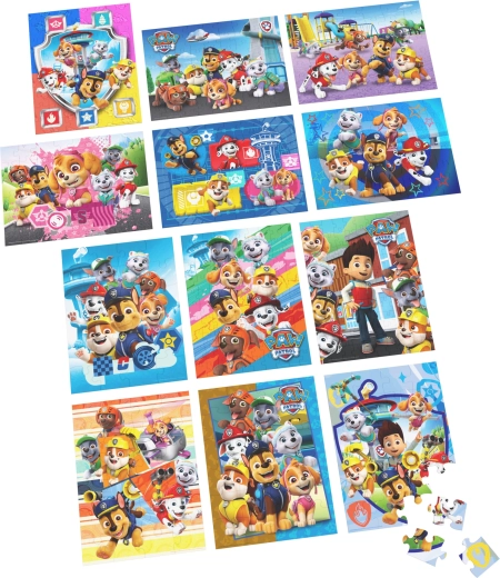 Le coffret contient 12 puzzles de difficulté variable : 4× 24 pièces, 3× 48 pièces et 5× 63 pièces. Les enfants peuvent ainsi passer des images plus simples aux plus complexes et renforcer leurs compétences pas à pas.