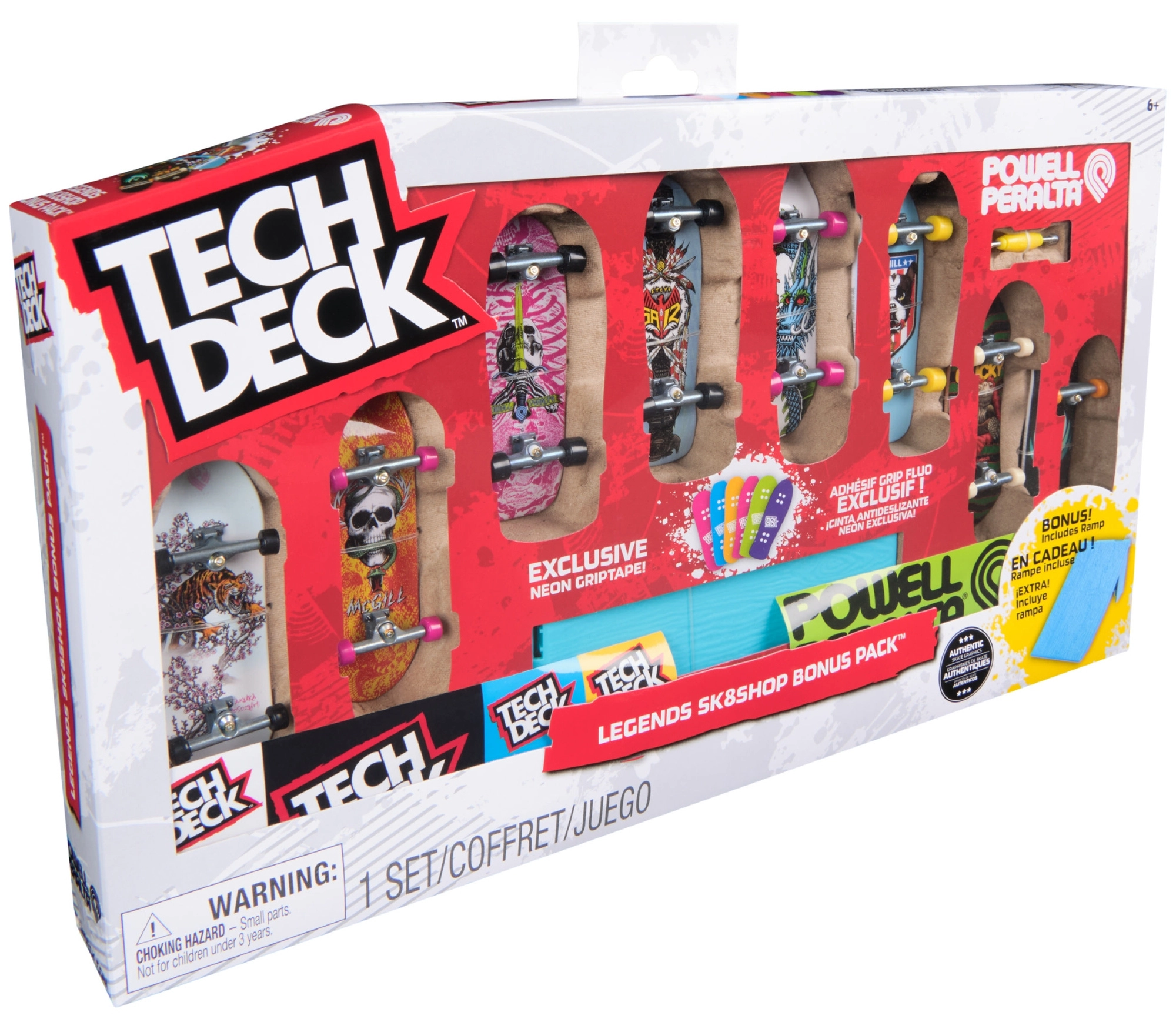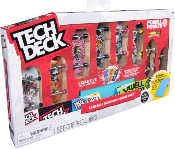 Découvrez l’univers du fingerboard avec la marque légendaire TECH DECK, qui inspire les fans du monde entier depuis plus de 20 ans. Cet ensemble exclusif Legends Sk8shop Bonus Pack propose 8 fingerboards prêts à l’emploi aux designs colorés et une rampe néon pour les sauts et les figures.