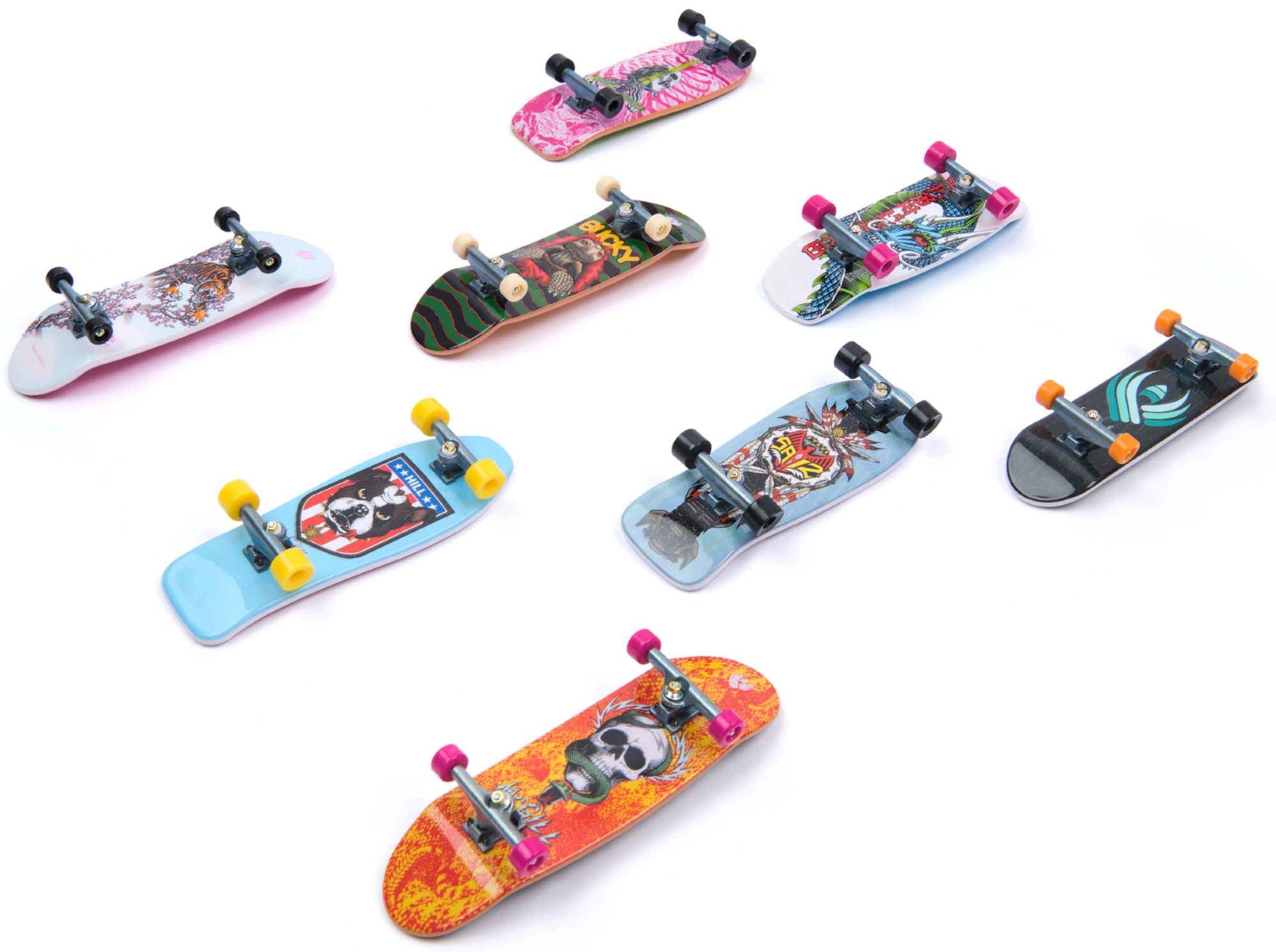 Le coffret comprend huit fingerboards complets avec des imprimés colorés percutants et des trucks et roues réalistes. Parfaits pour la collection comme pour une utilisation quotidienne.