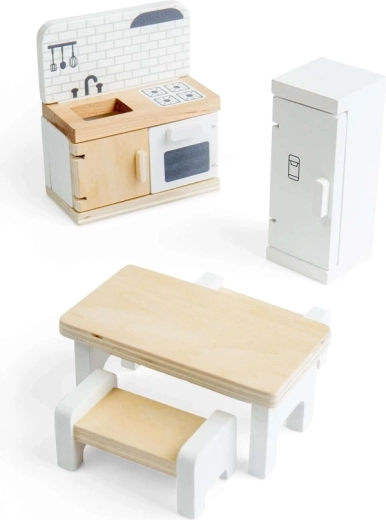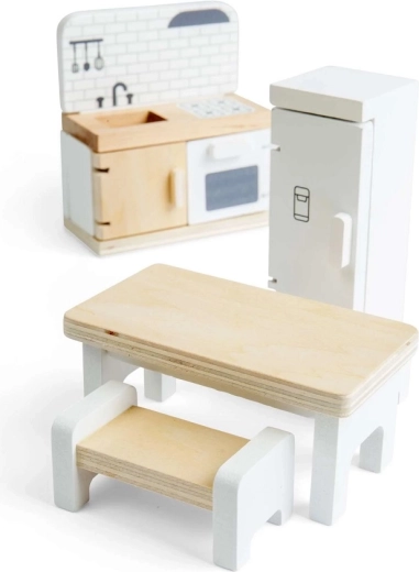 La fabrication de qualité en bois certifié FSC garantit une grande résistance pour un usage quotidien et des surfaces lisses et sûres. Le set est compatible avec la plupart des maisons de poupées courantes et se combine aisément avec d’autres pièces et accessoires.