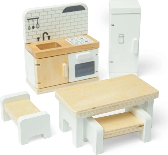 - Contenu du set : réfrigérateur, meuble de cuisine avec évier, cuisinière et four, table à manger, 2× banc