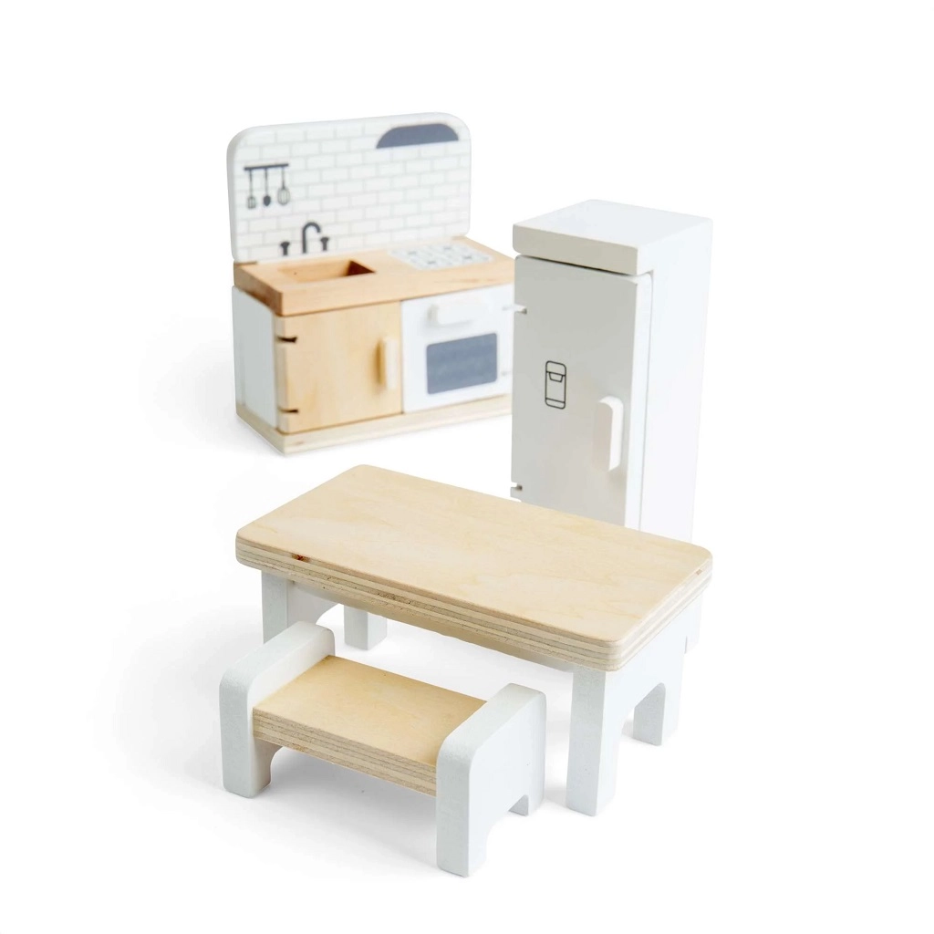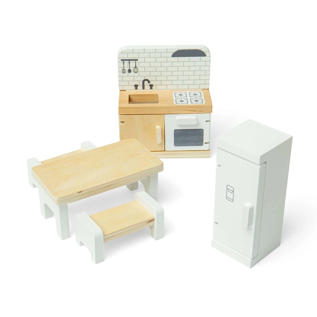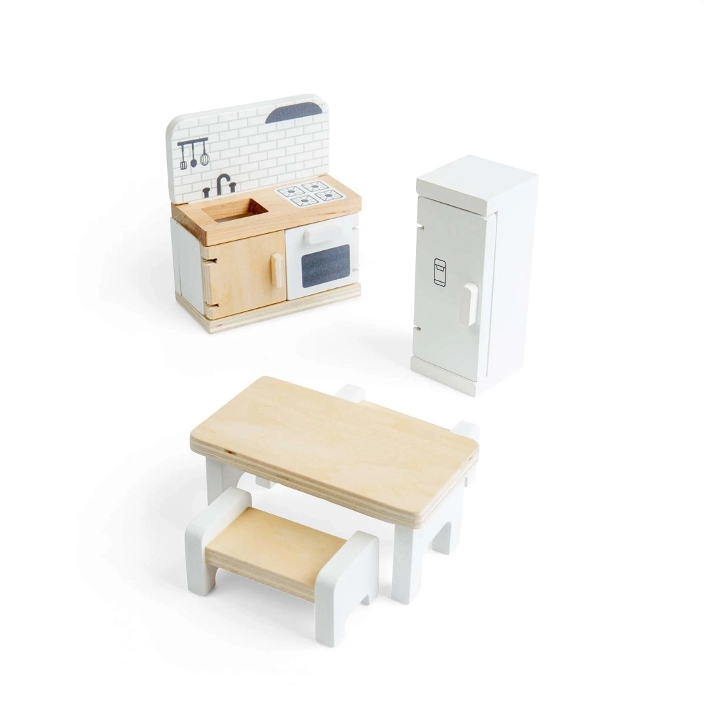 Transformez votre maison de poupées en une cuisine chaleureuse avec ce set de qualité de Bigjigs Toys. L’ensemble comprend un réfrigérateur, un meuble avec évier, cuisinière et four, une table à manger et 2 bancs pour un jeu de rôle réaliste. La finition lisse en bois avec certification FSC est durable, sûre et respectueuse de la nature. Favorise la créativité, la motricité fine et le jeu en groupe dès 3 ans.
