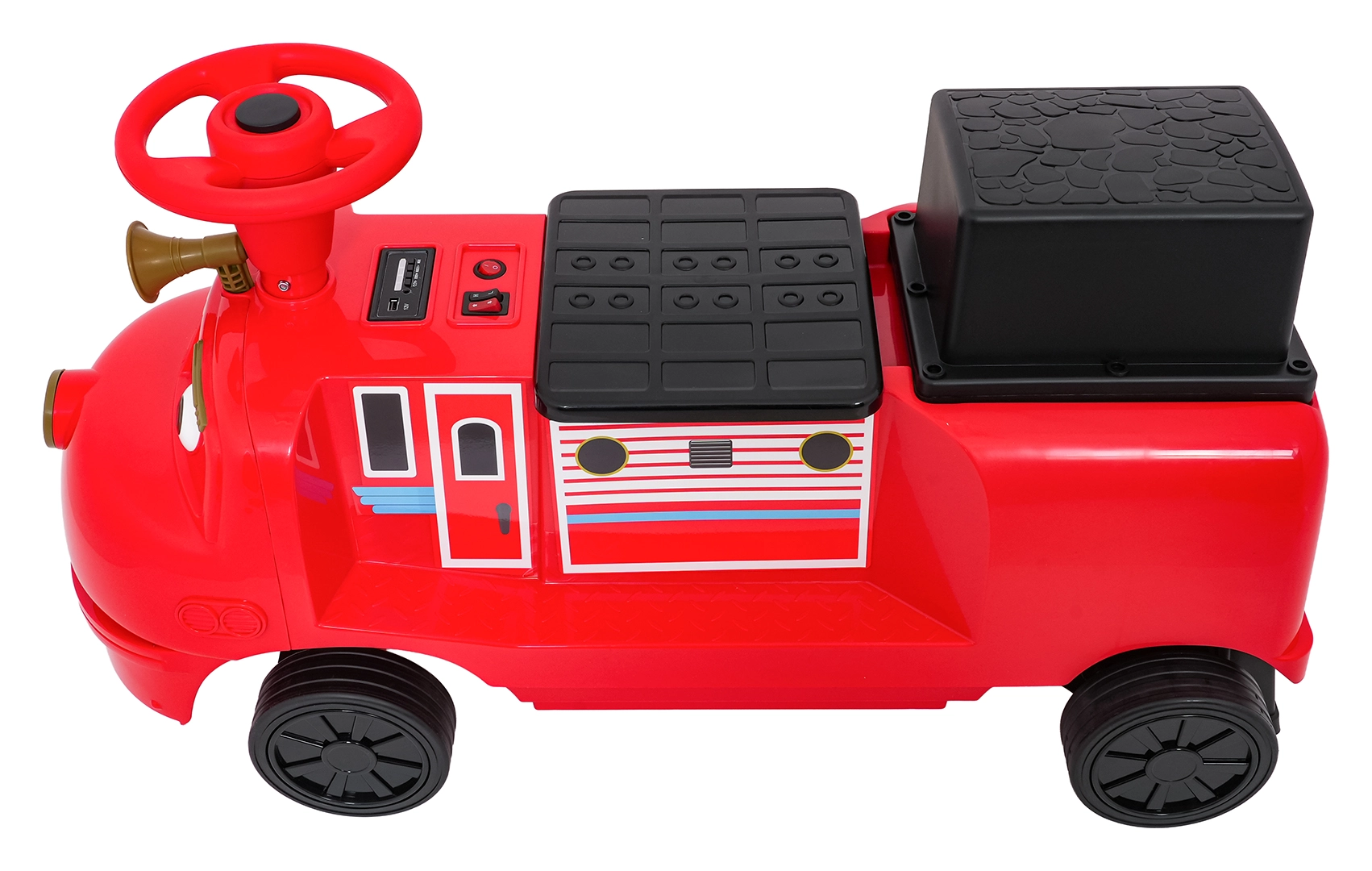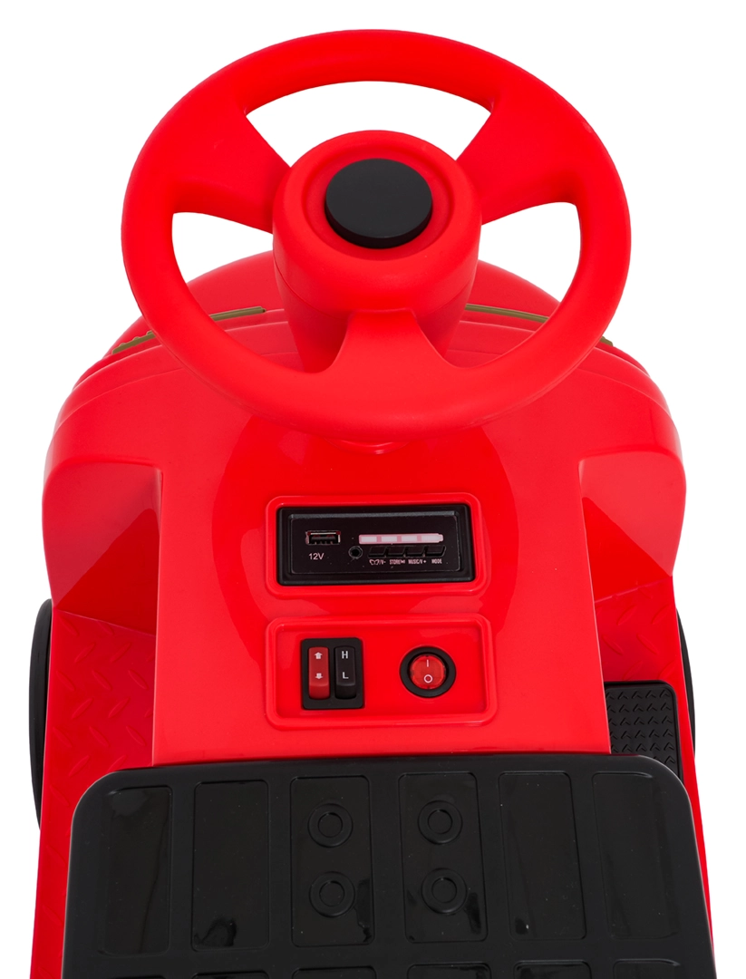 Locomotive rouge électrique amusante pour enfants avec deux moteurs 2×35 W, batterie puissante 12 V/7 Ah et roues en caoutchouc pour une conduite fluide et silencieuse. Grâce au démarrage en douceur, à deux vitesses avant et aux phares LED avant, les petits conducteurs profitent d’un trajet sûr et attractif. Le panneau audio intégré avec Bluetooth, MP3, USB et AUX lit les mélodies préférées, avec bouton sonore et klaxon. Charge maximale jusqu’à 60 kg et siège double pour s’amuser même à deux frères et sœurs.