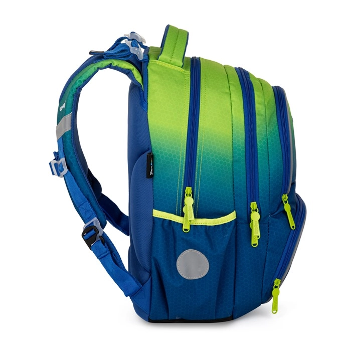 Ensemble scolaire pratique pour les élèves du CE1 au CM1, comprenant le sac à dos ergonomique OXY NEXT, une trousse spacieuse et un sac de sport. Le sac à dos possède un dos anatomique, des bretelles rembourrées avec sangle de poitrine, des éléments réfléchissants et de nombreuses poches pour une organisation parfaite. Un fond imperméable résistant, une construction légère et un design ombré moderne dans des tons bleu‑vert assurent confort et sécurité au quotidien.