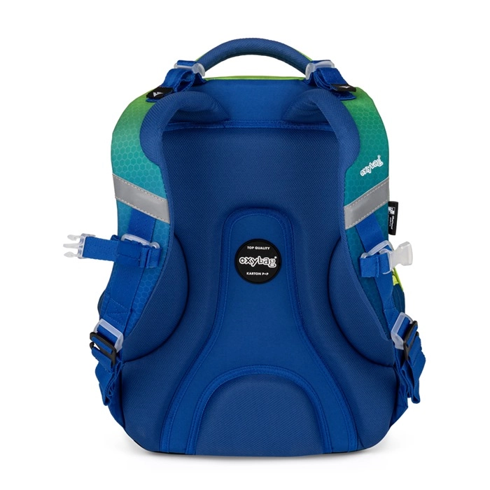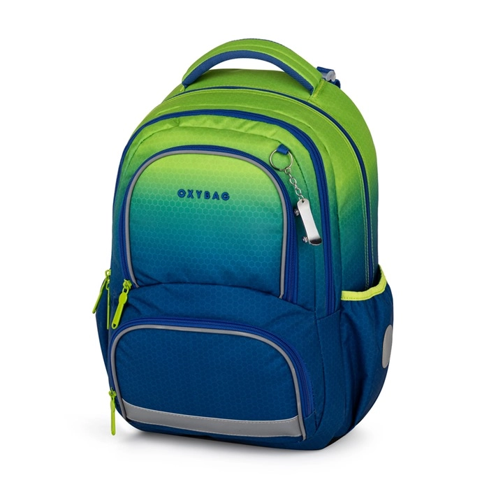 L’organisation bien pensée comprend plusieurs compartiments et poches, dont deux poches latérales spacieuses et un porte‑clés/porte badge scolaire, pour que rien ne se perde. L’ensemble est complété par une trousse OXYBAG spacieuse et un sac de sport léger assorti au design ombré, idéals pour ranger les fournitures d’écriture et les vêtements de sport.