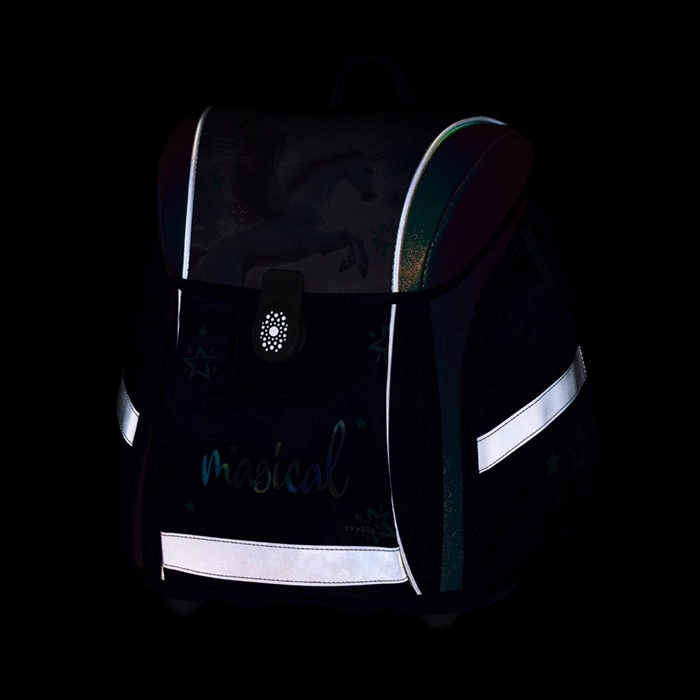 Éléments réfléchissants pour une meilleure visibilité, fermeture magnétique pour un accès rapide et séparateur intérieur avec poches pour garder les fournitures scolaires bien rangées.