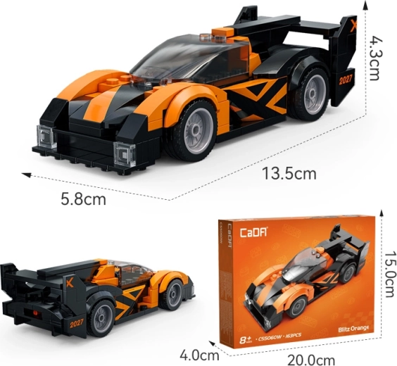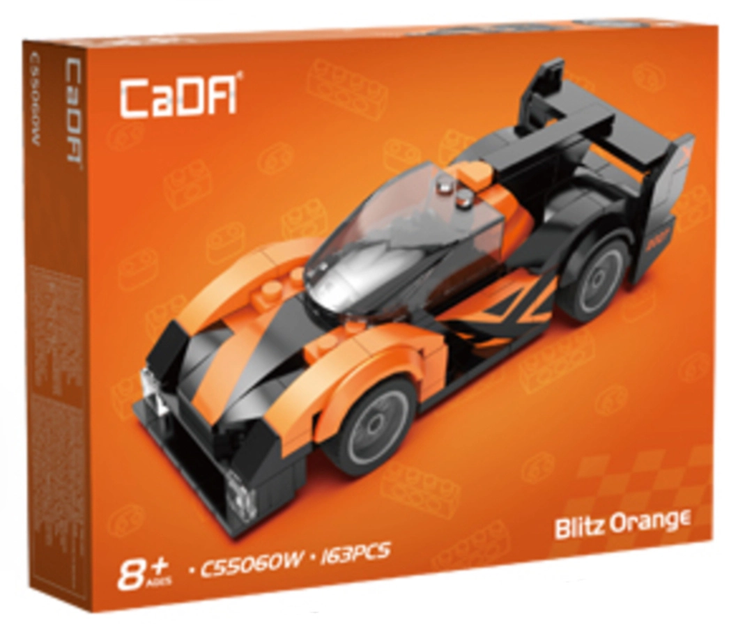 La voiture de course CaDA Blitz Orange ravira tous les amateurs de construction et de vitesse. Grâce à ses 163 briques parfaitement ajustées, vous assemblerez un modèle compact au profil aérodynamique, avec cockpit transparent et feux marquants. Les roues fonctionnelles permettent un déplacement fluide sur surface plane – idéal pour jouer ou exposer.