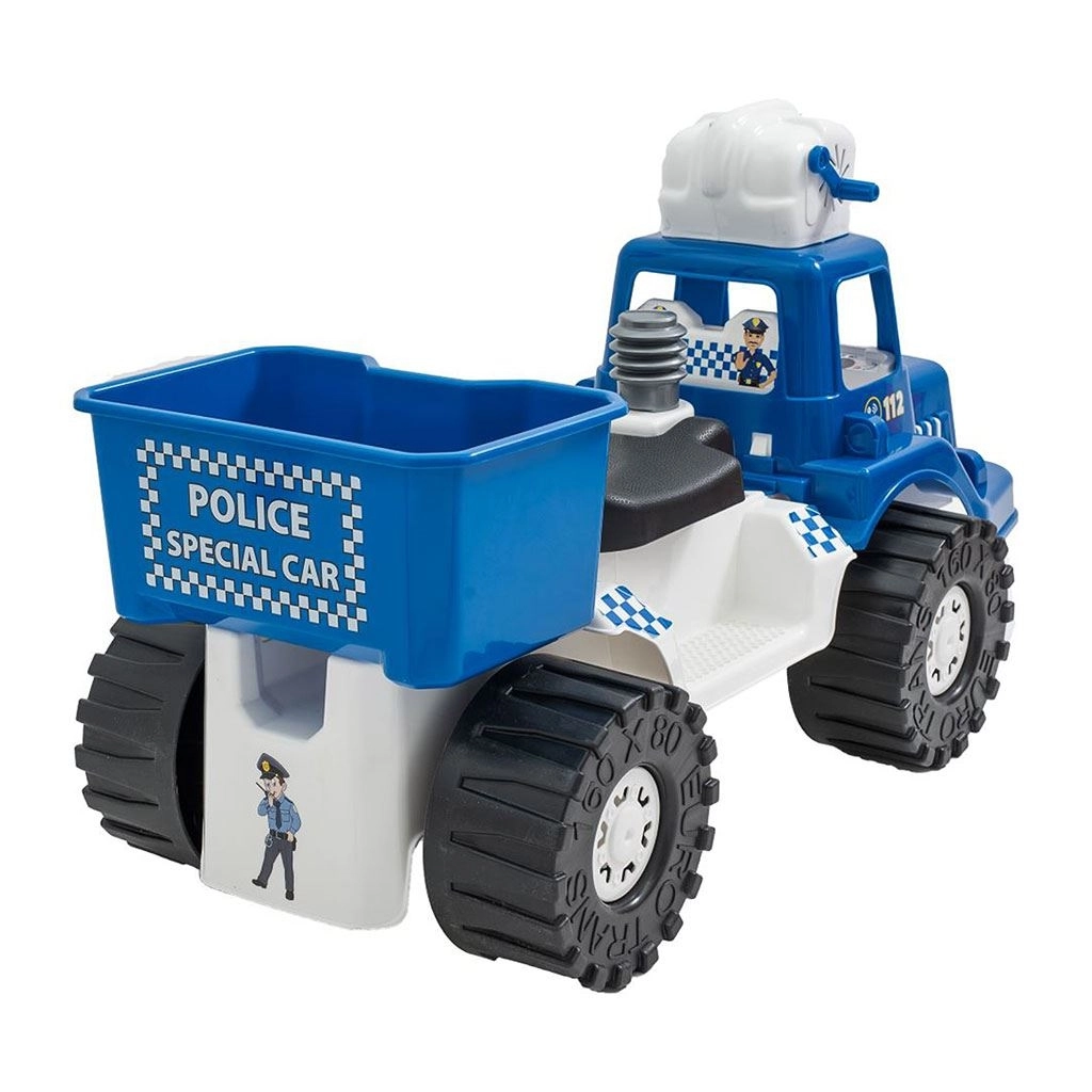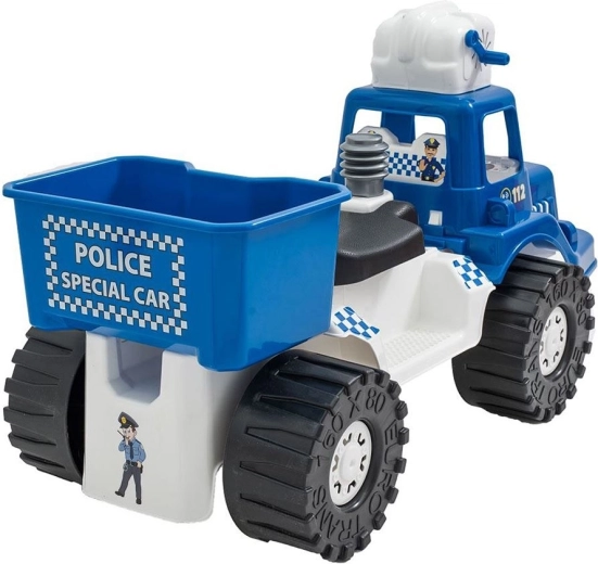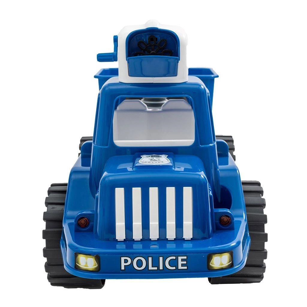 Sous la selle se trouve un boîtier pratique pour les jouets ou la solution à bulles, afin que le petit policier ait tout à portée de main même lors des plus longues expéditions.
