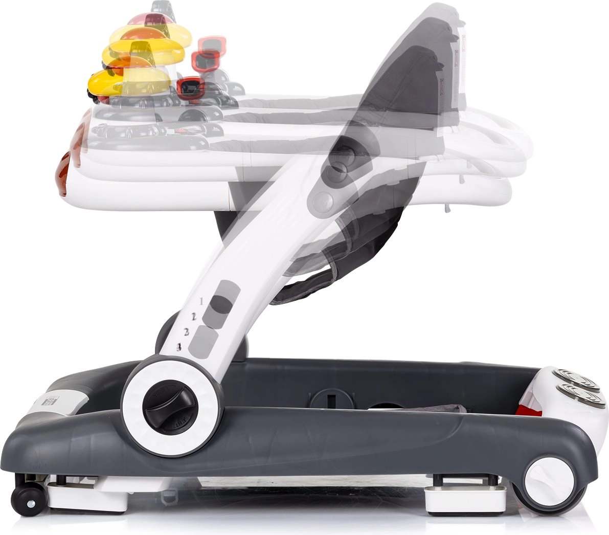 - Trotteur, centre d’activités, mode sauteur, pousseur/porteur