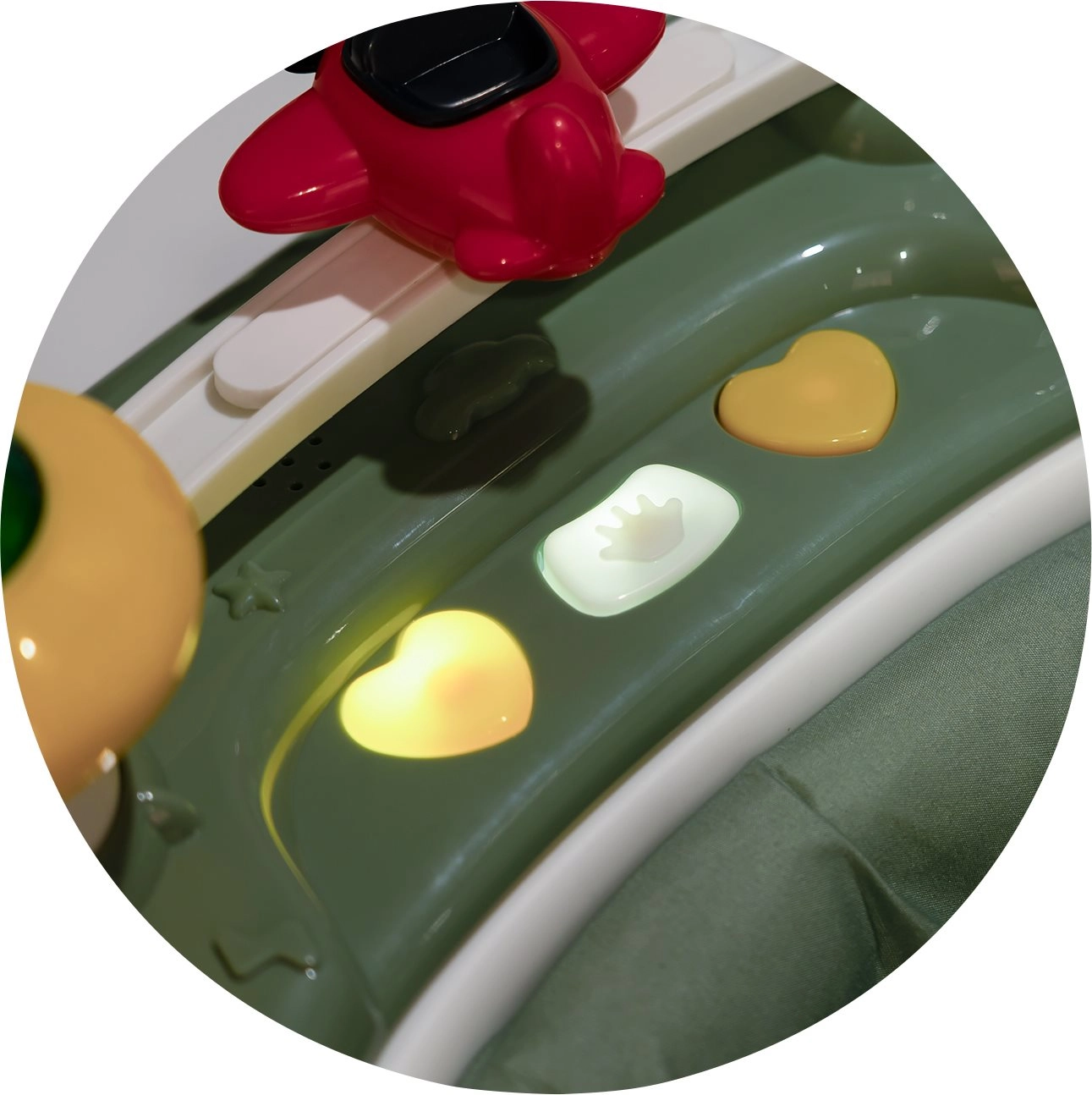 Des boutons colorés, des effets lumineux et des jouets mobiles stimulent les sens et la motricité fine, tout en divertissant l’enfant toute la journée.