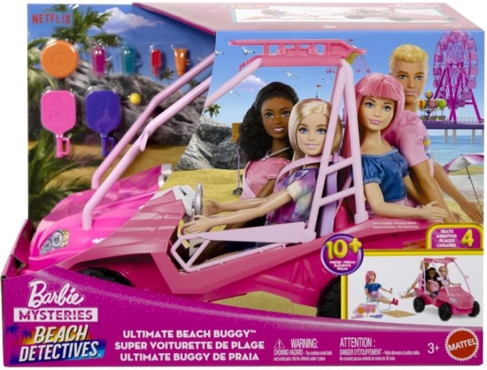 Cette buggy de plage BARBIE au rose éclatant est prête pour toutes les aventures côtières. Grâce à ses grandes roues tout-terrain, à son châssis ouvert et à des détails comme le volant ou le porte-bagages de toit, elle paraît réaliste tout en restant sûre et facile à manœuvrer pour les petites mains.