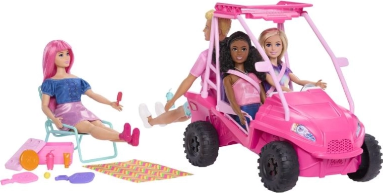 Partez à l’aventure avec la buggy de plage BARBIE rose, offrant de la place pour jusqu’à quatre poupées, de robustes roues tout-terrain et un porte-bagages de toit pratique. Plus de 10 accessoires de plage – dont un fauteuil, une serviette, une glacière et des en-cas – stimulent le jeu créatif et la narration. Idéal pour les enfants à partir de 3 ans. Poupées non incluses.