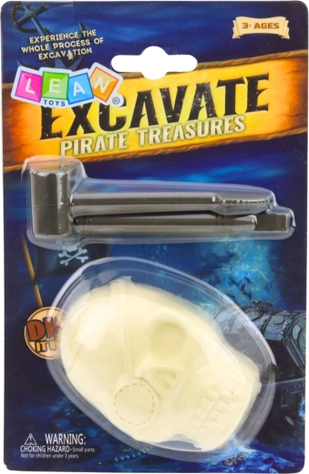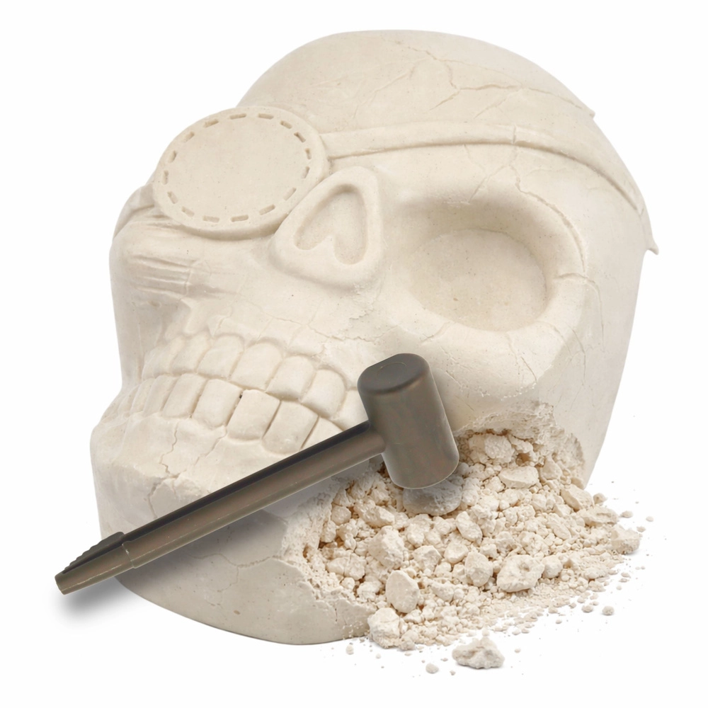 Un bloc de plâtre finement sculpté en forme de crâne de pirate invite au premier coup de ciseau et de marteau et renferme une surprise à l’intérieur.