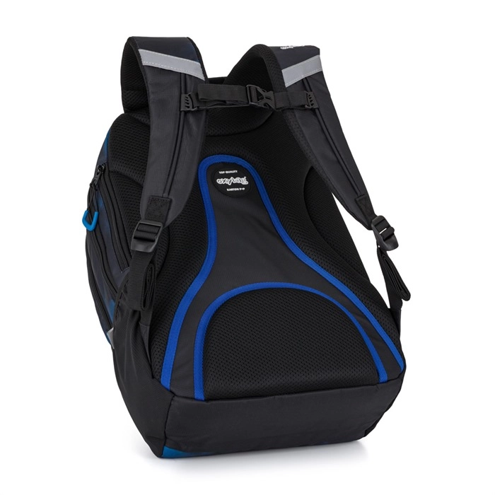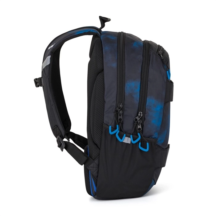 L'espace intérieur est intelligemment conçu : deux compartiments principaux accueillent livres et classeurs, une poche renforcée protège en toute sécurité l'ordinateur portable, une petite poche et un mousqueton maintiennent l'ordre pour les petits objets. Une poche discrète au dos met les objets de valeur à l'abri, la poche latérale est prévue pour une bouteille. Les éléments réfléchissants augmentent la visibilité sur le trajet de l'école comme du retour.