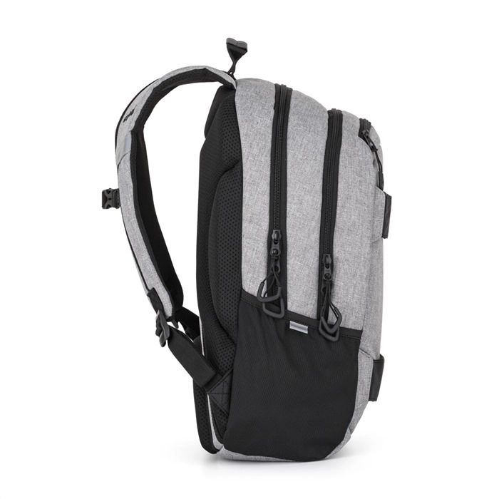 À l’intérieur se trouvent une poche renforcée pour ordinateur portable, un mousqueton pour clés, une petite poche pour objets de valeur et une poche cachée dans le panneau dorsal. Sur le côté, une poche pour bouteille ; les éléments réfléchissants améliorent la visibilité en ville. L’ensemble comprend une trousse étudiante avec passants élastiques et fermeture éclair pour ranger clairement les fournitures d’écriture.